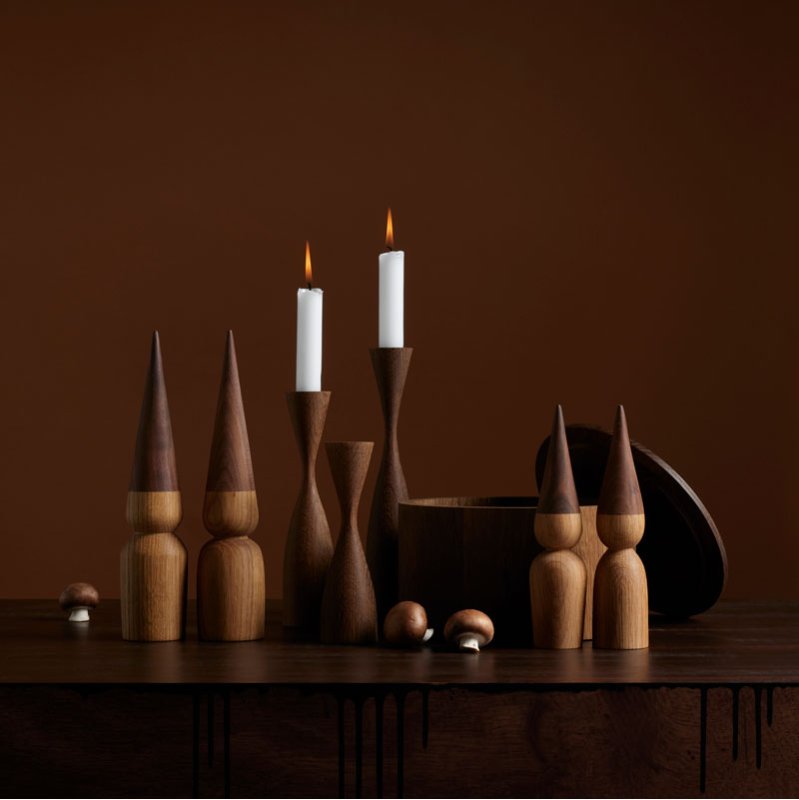 Handmade in Denmark from repurposed wood, the Caroline and Christian Elves are here to liven up your home for the holidays. Each elf has a clean, simplified form with a body made of walnut and a cap of dark oak.