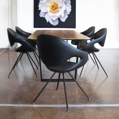The Moon Chair by Tonon Italia blends comfort, innovation, and practicality for a futuristic, versatile look. Moon's wide, rounded seat and gentle shape contrast with its sleek cutout, while the black "Soft Touch" polyurethane shell has a lightly flexible yet firm feel and is easy to keep clean.