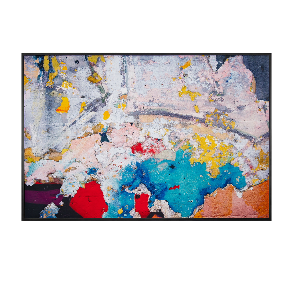 [0] => The Abstract Hues Wall Art is a contemporary, abstract piece that features overlapping colors and rough-edged shapes to give the impression of layered paints that show the passage of time as they age. Bright yellow, red, purple, blue, and orange poke through subtler white, grey, and pale pink, creating a textured look with a range of colorful hues that can integrate into any design environment. The Abstract Hues Wall Art is a gicle print with a black frame.