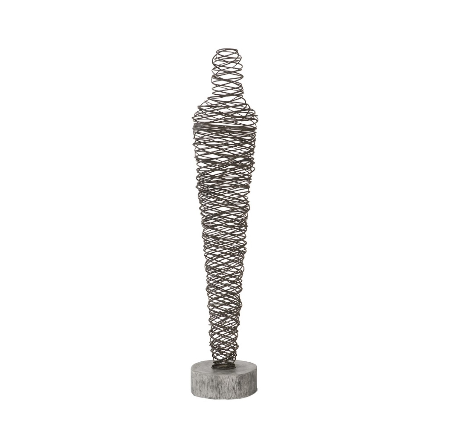 [0] => The Small Abstract Wire Man Sculpture is chic and industrial, and features a hazy silhouette of a human figure formed from metal wire resting on a grey wooden base. Fluid and dynamic, this contemporary piece will be an eye-catching addition to your home or office space and, at 76" tall, serves as a focal point of organic artistry.