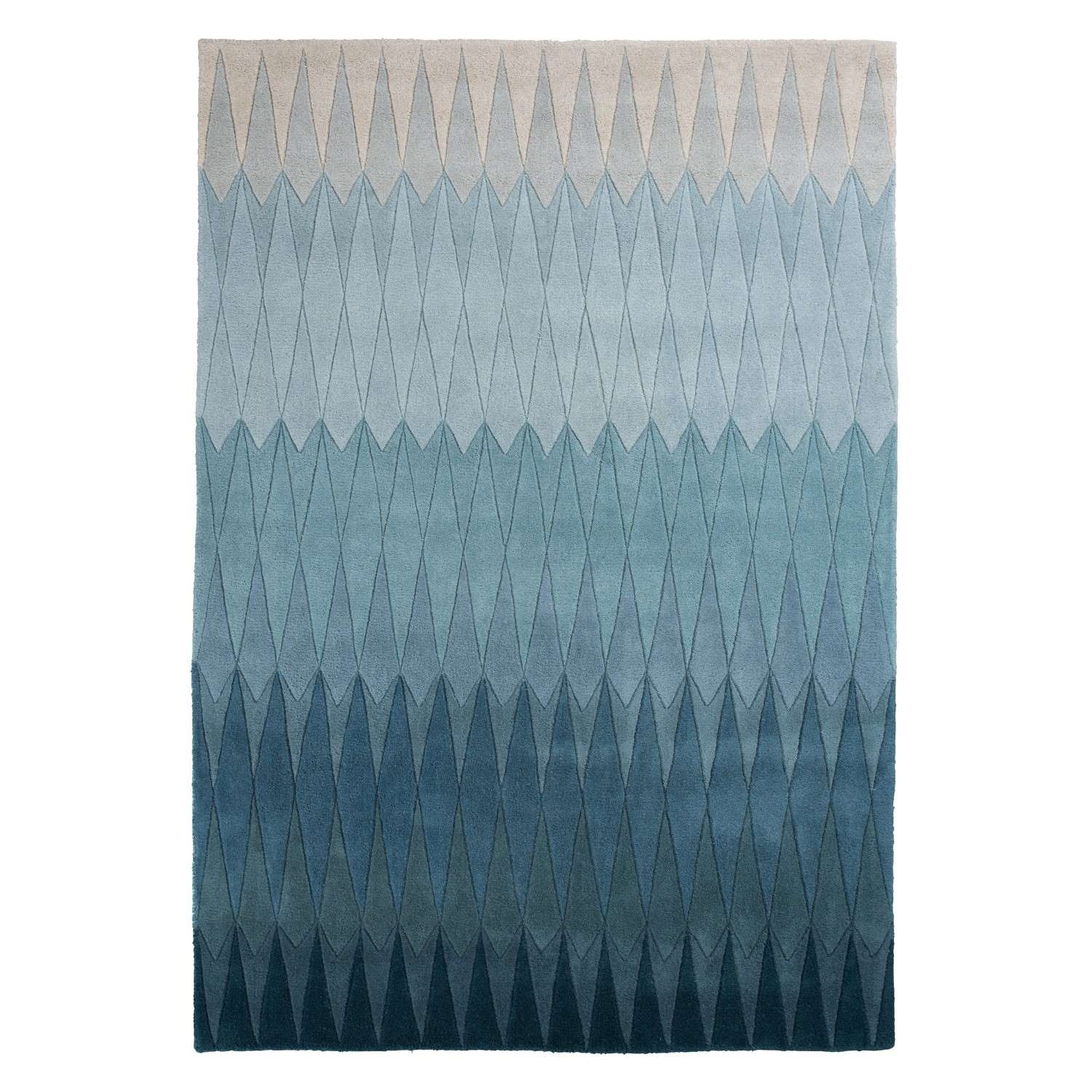 [0] => The Acacia Rug boasts an eye-catching pattern of overlapping diamond shapes in a color spectrum that ranges from off-white to sky blue, to dark navy. Designed by Hanne Kortegaard, this rug is hand-tufted from wool for superior softness and durability. With its soothing color gradient, lively pattern, and skillful construction, Acacia will turn any floor into a style statement.