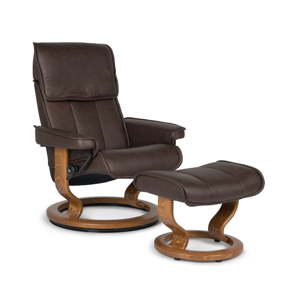 The Admiral Large Chair and Ottoman, designed by Ekornes of Norway, has a classic design with cutting edge comfort technology. Available with a classic teak base and chocolate Paloma leather upholstery, this piece provides full-body support, with an ample pillow-like headrest, and matching stiching. Admiral is equipped with Stressless® Plus™ and Glide systems, which allow the chair to provide continuous support for the head and lower back, while also adjusting the reclining angle based on shifts of the body.