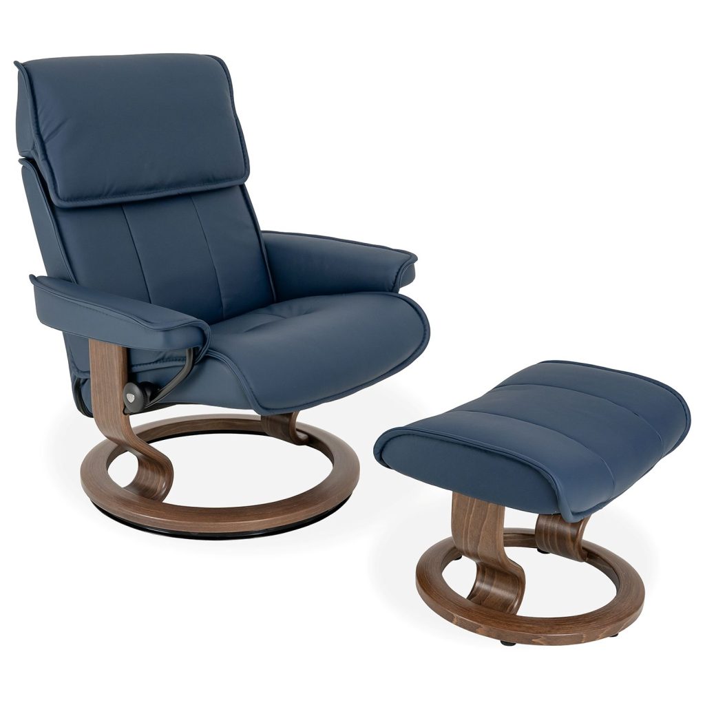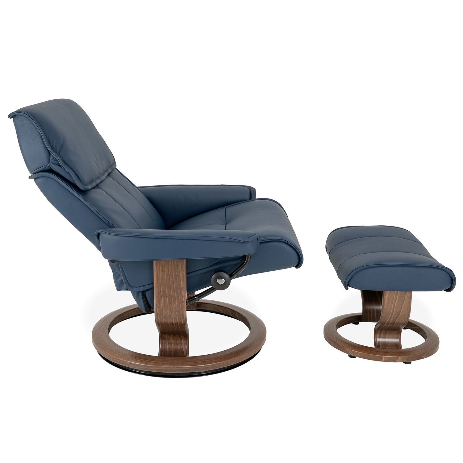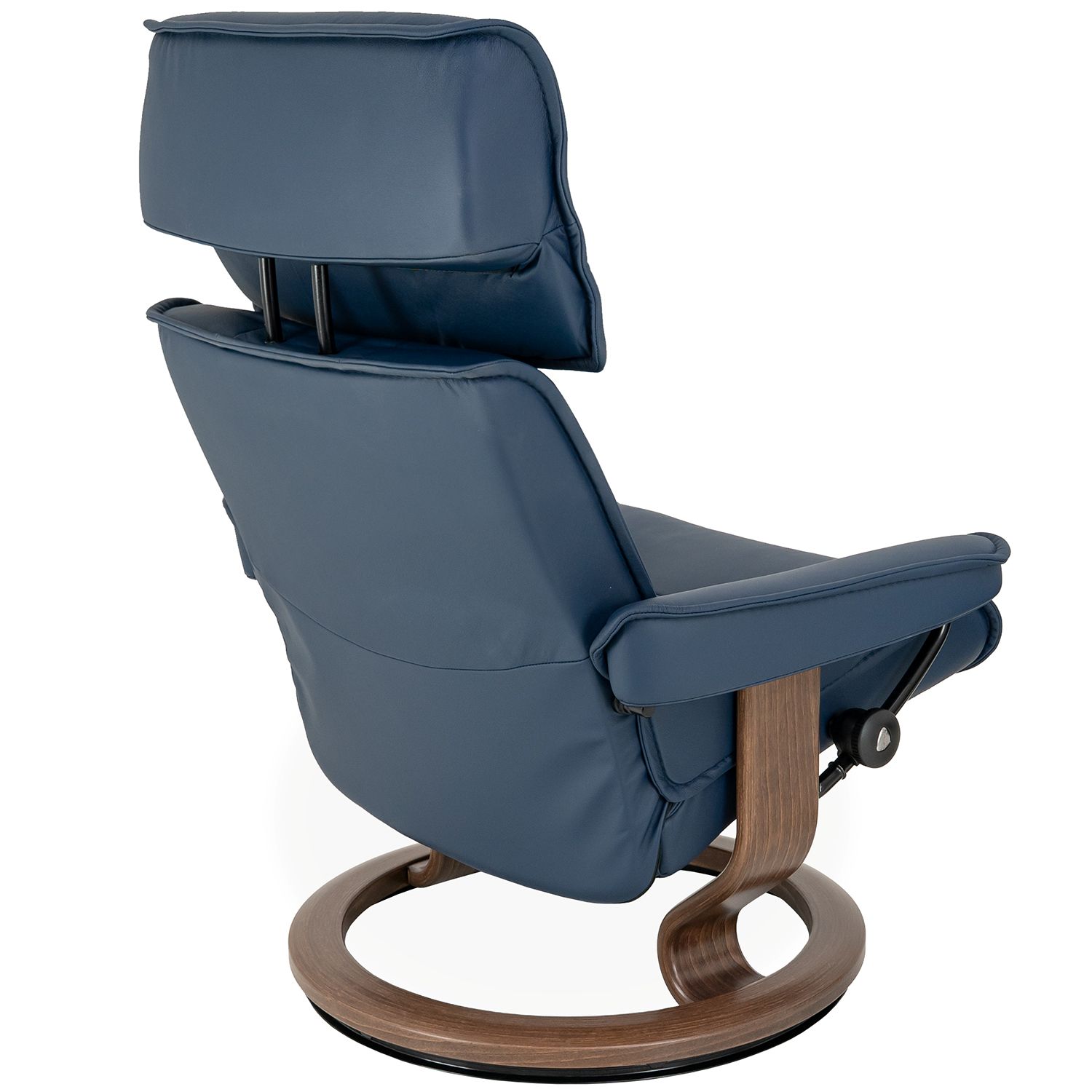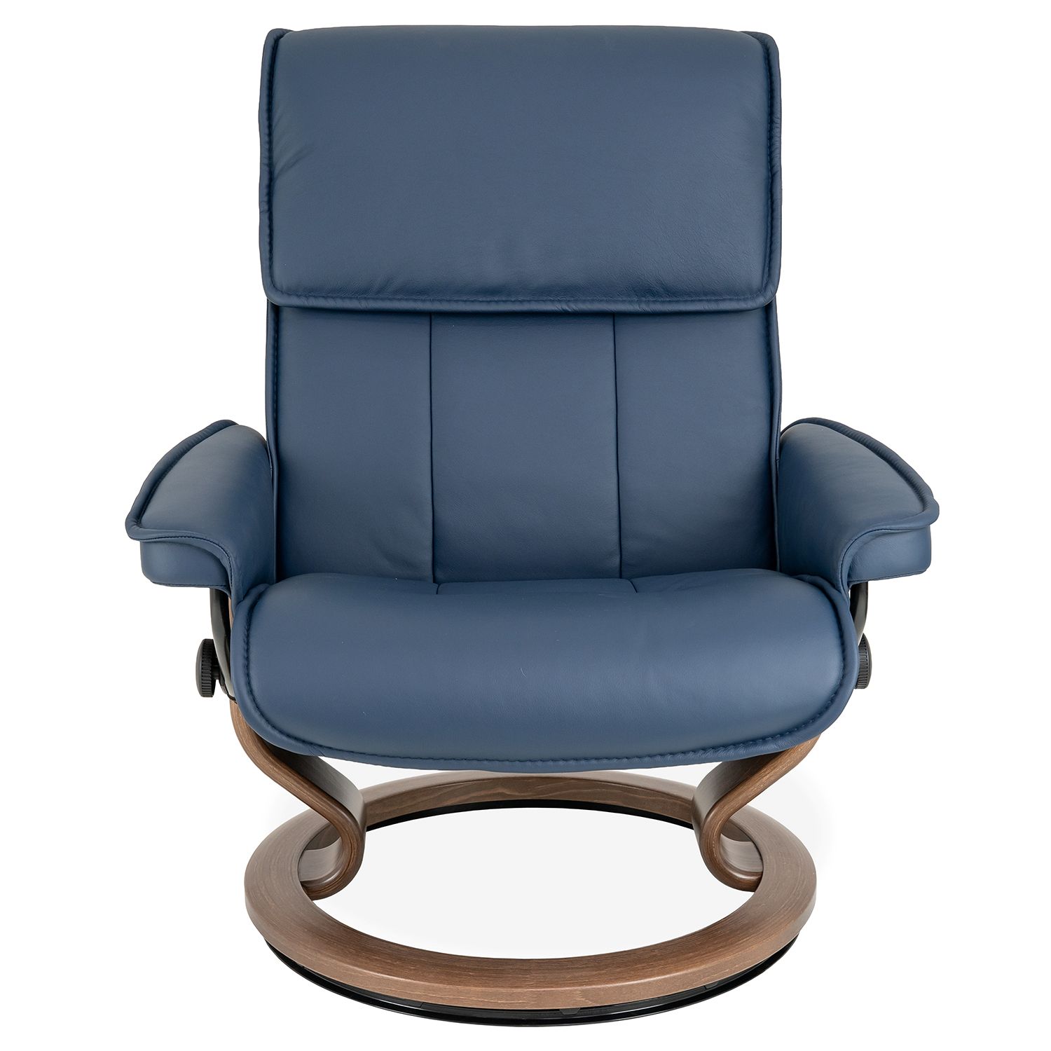 The Admiral Large Chair and Ottoman, designed by Ekornes of Norway, has a classic design with cutting edge comfort technology. Available with a classic teak base and Oxford blue Paloma leather upholstery, this piece provides full-body support, with an ample pillow-like headrest, and matching stiching. Admiral is equipped with Stressless® Plus™ and Glide systems, which allow the chair to provide continuous support for the head and lower back, while also adjusting the reclining angle based on shifts of the body.