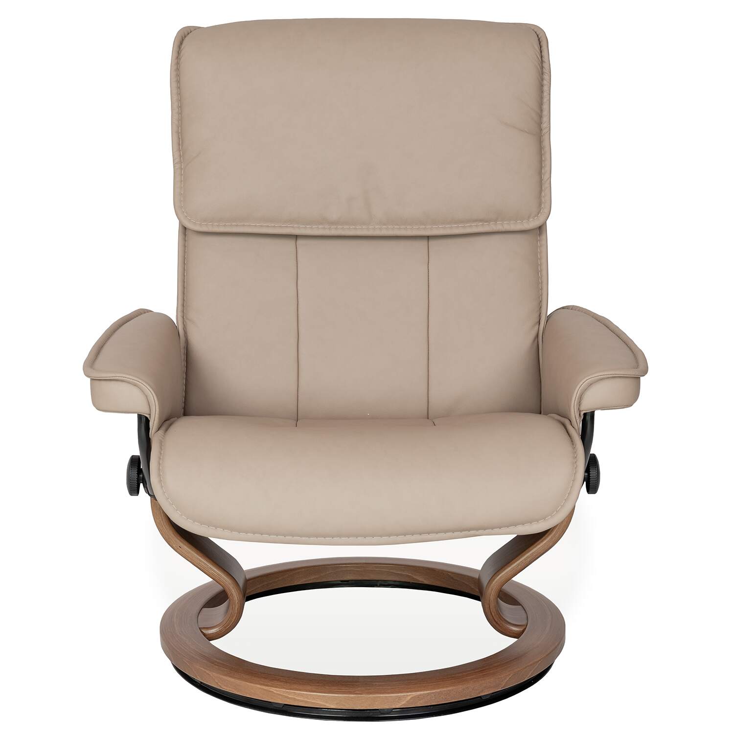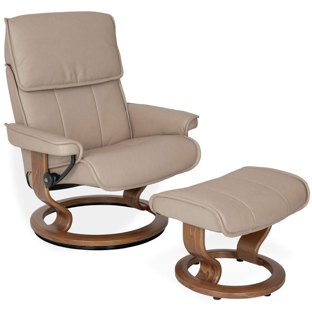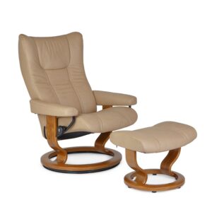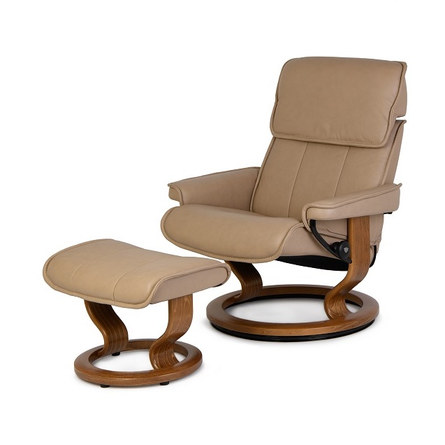 The Admiral Large Chair and Ottoman, designed by Ekornes of Norway, has a classic design with cutting edge comfort technology. Available with a classic teak base and sand Paloma leather upholstery, this piece provides full-body support, with an ample pillow-like headrest, and matching stiching. Admiral is equipped with Stressless® Plus™ and Glide systems, which allow the chair to provide continuous support for the head and lower back, while also adjusting the reclining angle based on shifts of the body.