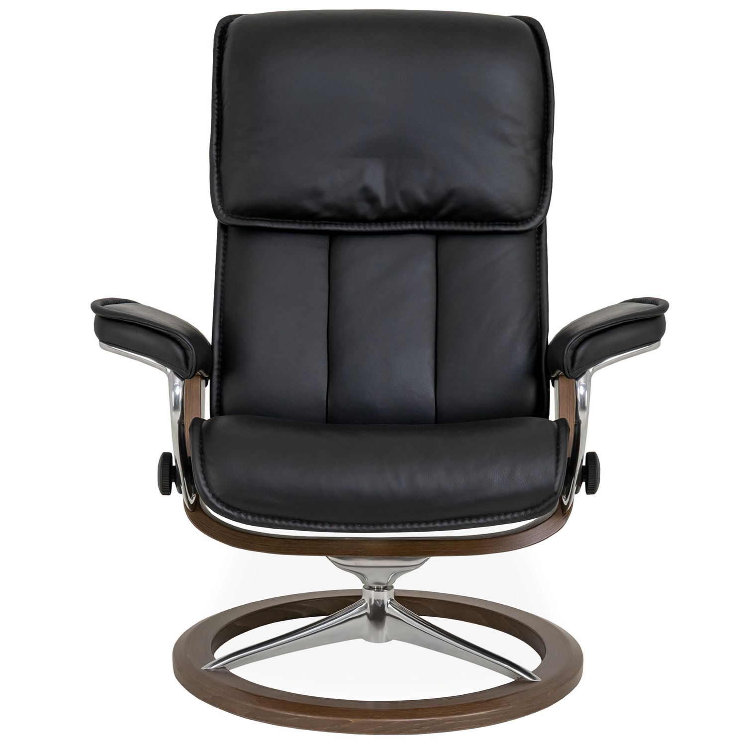 The Admiral Large Chair & Ottoman, designed by Ekornes of Norway, has a classic design with cutting edge comfort technology. Available with a signature walnut base and black Paloma leather upholstery, this piece provides full-body support, with an ample pillow-like headrest, and matching stitching. Admiral is equipped with Stressless® Plus™ and Glide Systems, which allow the chair to provide continous support for the head and lower back, while also adjusting the reclining angle based on shifts of the body. The Signature base brings the comfort of the BalanceAdapt™ system, which equips the chair with a gentle rocking motion to adjust with shifts in body position.