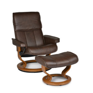 The Admiral Large Chair & Ottoman, designed by Ekornes of Norway, has a classic design with cutting edge comfort technology. Available with a signature teak base and chocolate Paloma leather upholstery, this piece provides full-body support, with an ample pillow-like headrest, and matching stitching. Admiral is equipped with Stressless® Plus™ and Glide Systems, which allow the chair to provide continous support for the head and lower back, while also adjusting the reclining angle base on shifts of the body. The Signature base brings the comfort of the BalanceAdapt™ system, which equips the chair with a gentle rocking motion to adjust with shifts in body position.