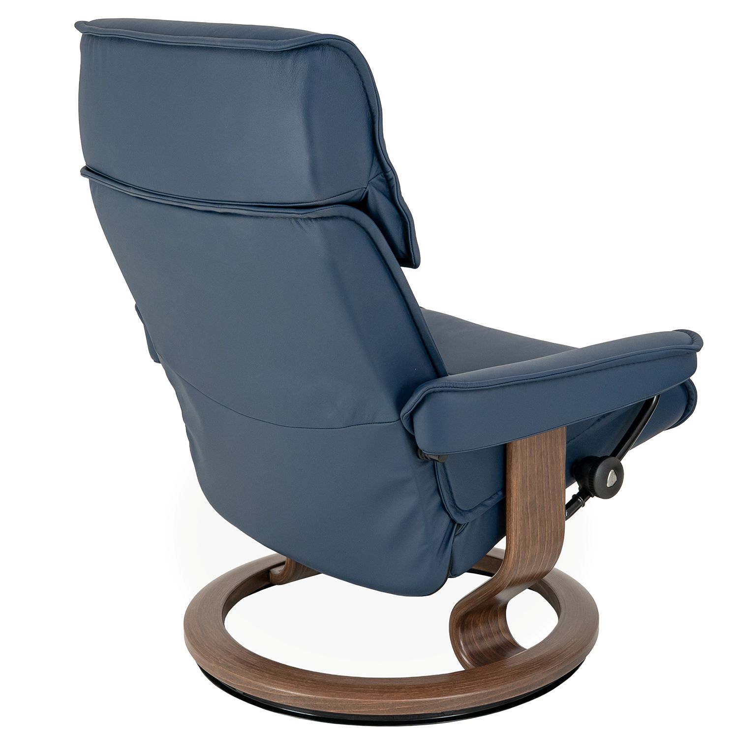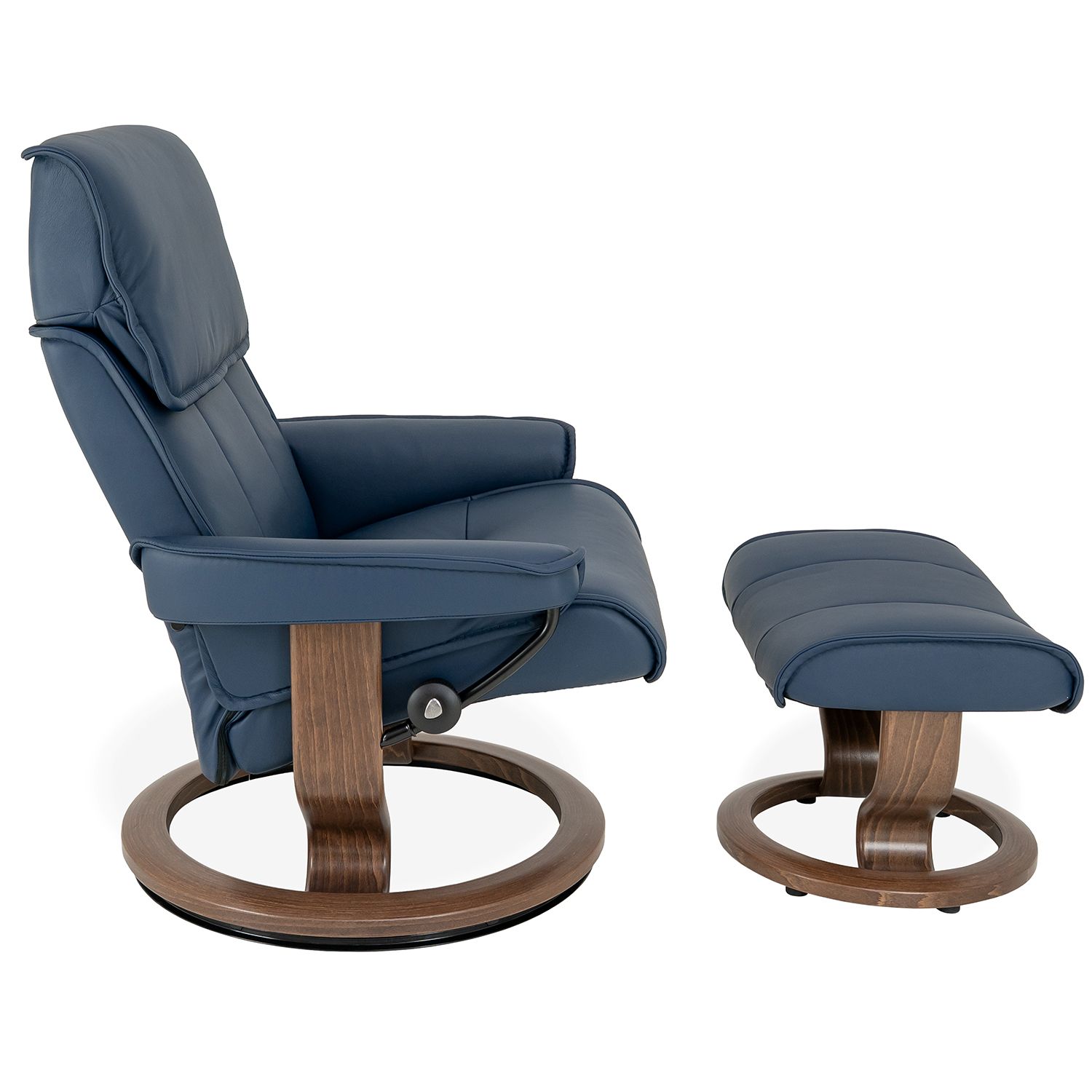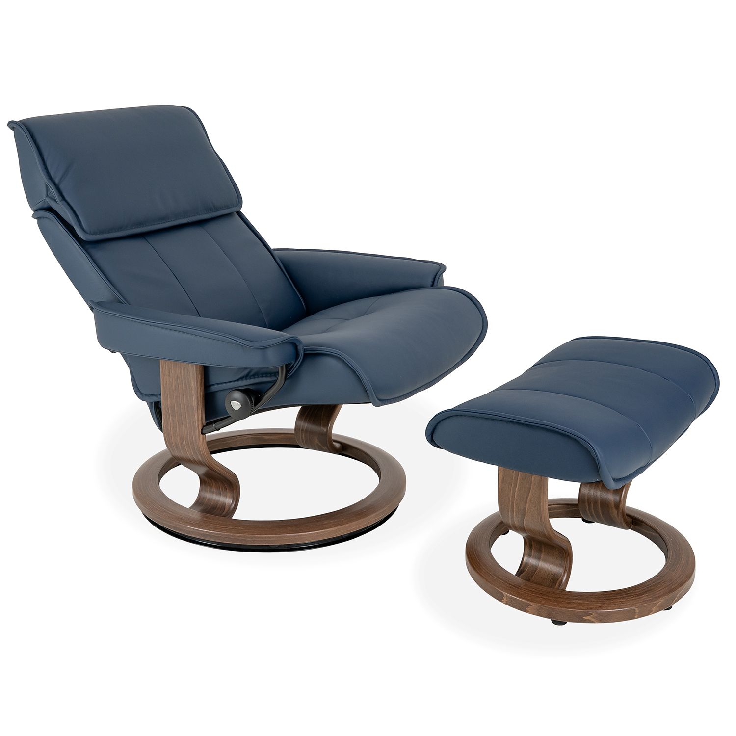 The Admiral Medium Chair and Ottoman, designed by Ekornes of Norway, has a classic design with cutting edge comfort technology. Available with a classic teak base and Oxford blue Paloma leather upholstery, this piece provides full-body support, with an ample pillow-like headrest, and matching stiching. Admiral is equipped with Stressless® Plus™ and Glide systems, which allow the chair to provide continuous support for the head and lower back, while also adjusting the reclining angle based on shifts of the body.