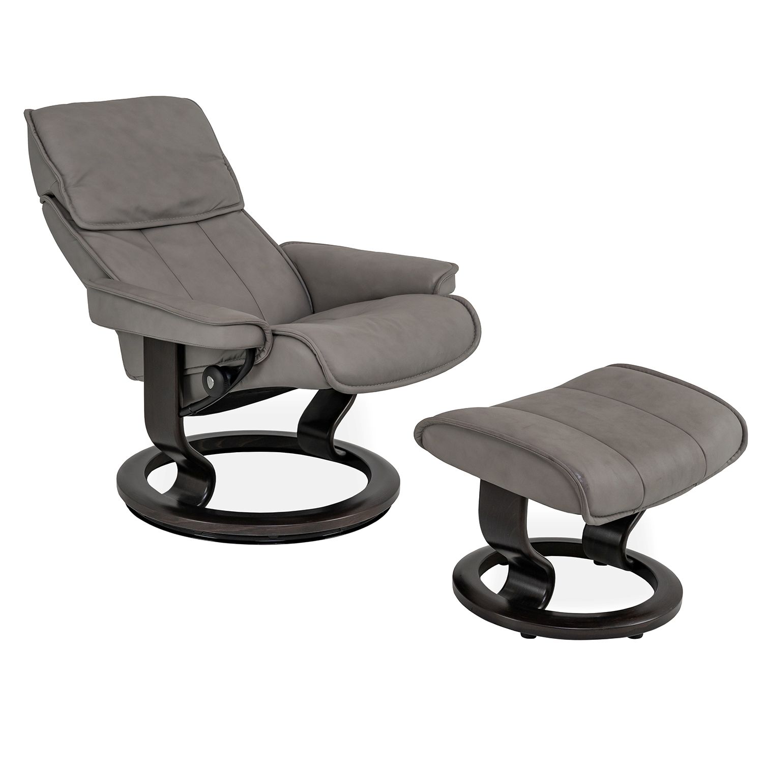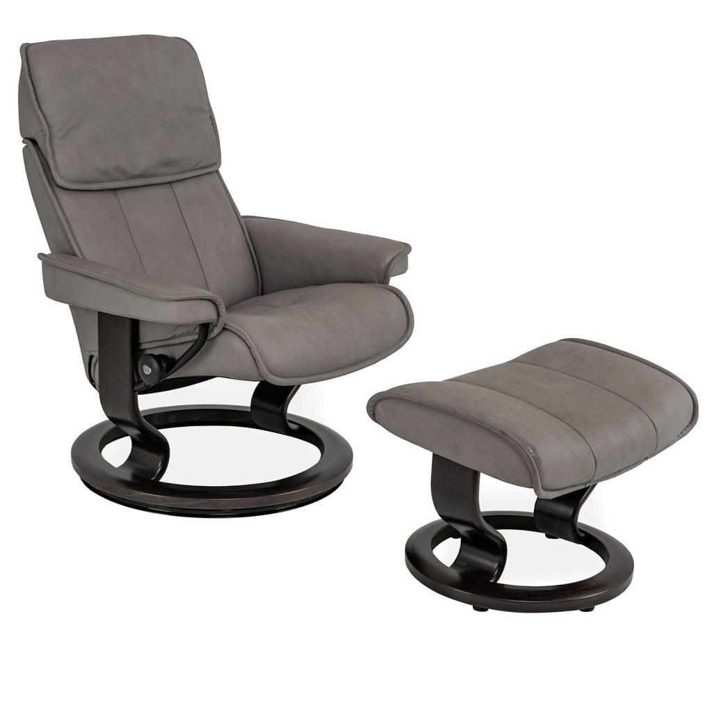 The Admiral Medium Chair and Ottoman, designed by Ekornes of Norway, has a classic design with cutting edge comfort technology. Available with a classic wenge finish base and silver grey Paloma leather upholstery, this piece provides full-body support, with an ample pillow-like headrest, and matching stiching. Admiral is equipped with Stressless® Plus™ and Glide systems, which allow the chair to provide continuous support for the head and lower back, while also adjusting the reclining angle based on shifts of the body.