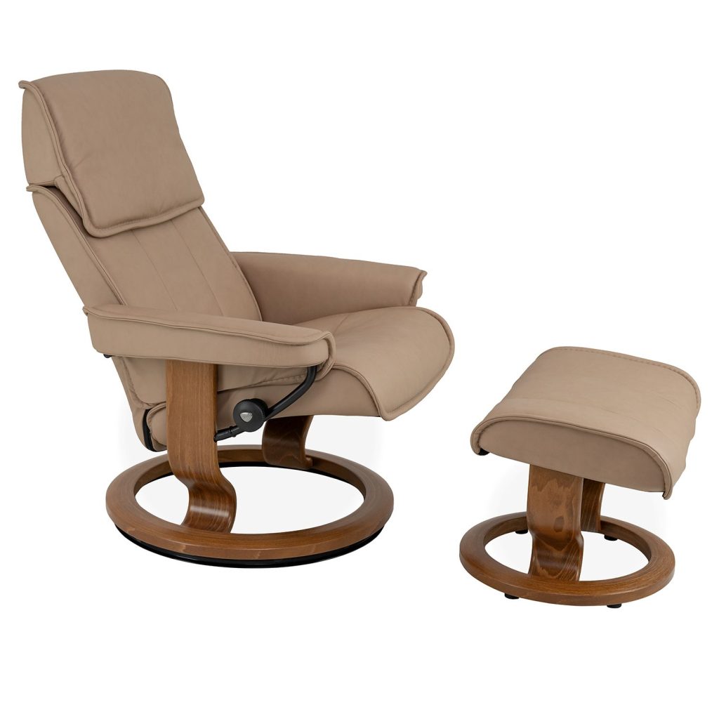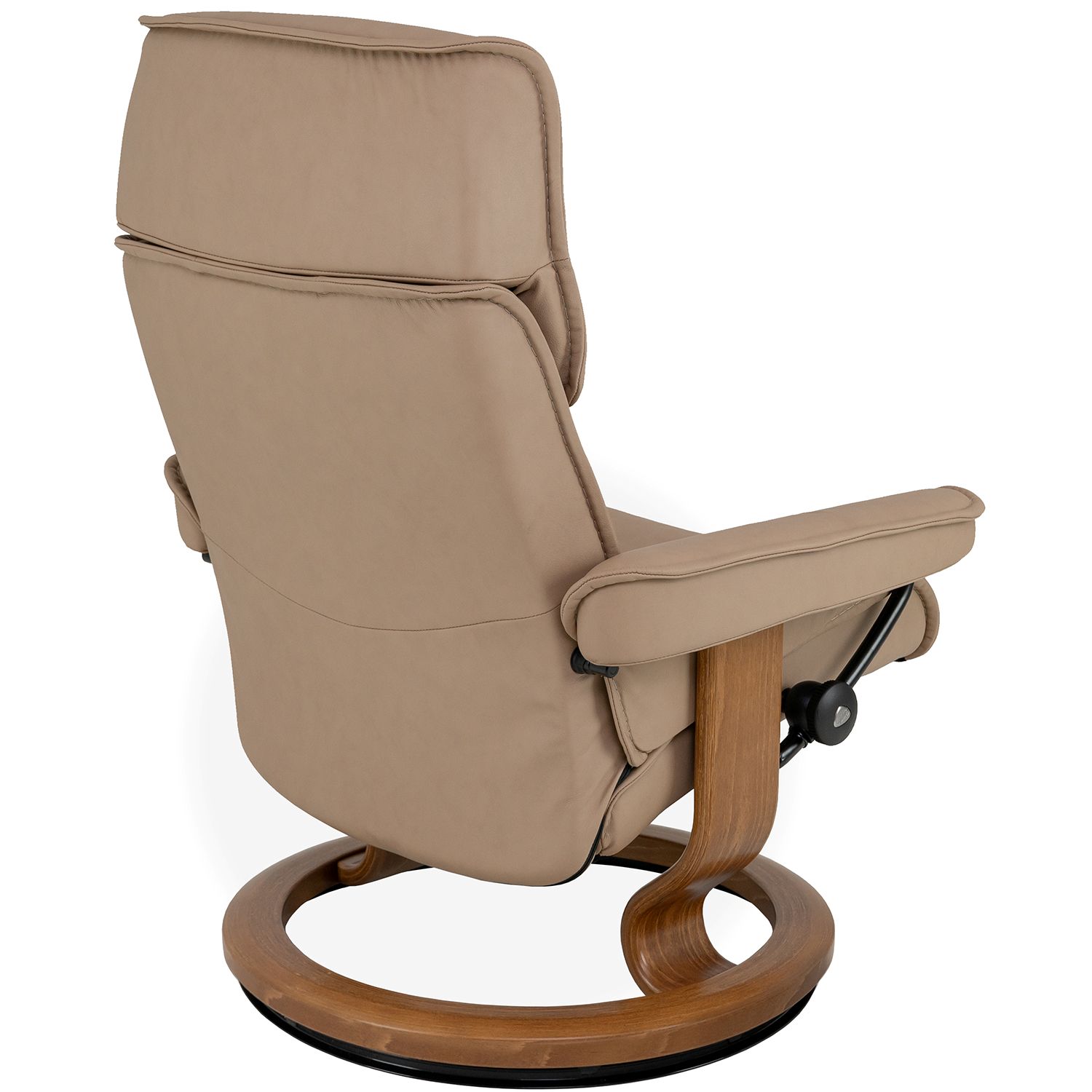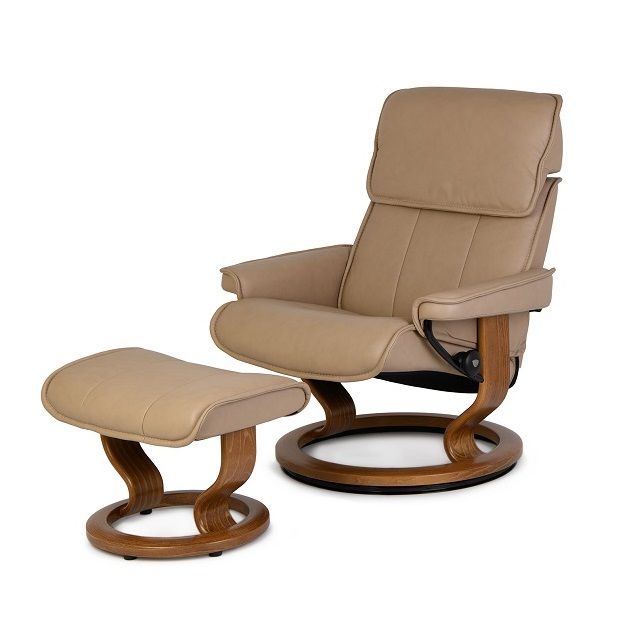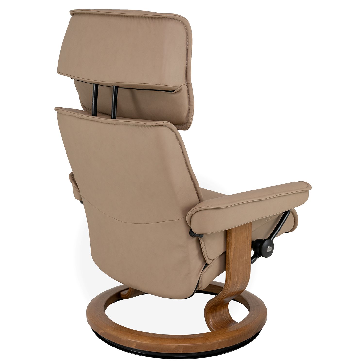 The Admiral Medium Chair and Ottoman, designed by Ekornes of Norway, has a classic design with cutting edge comfort technology. Available with a classic teak base and sand Paloma leather upholstery, this piece provides full-body support, with an ample pillow-like headrest, and matching stiching. Admiral is equipped with Stressless® Plus™ and Glide systems, which allow the chair to provide continuous support for the head and lower back, while also adjusting the reclining angle based on shifts of the body.