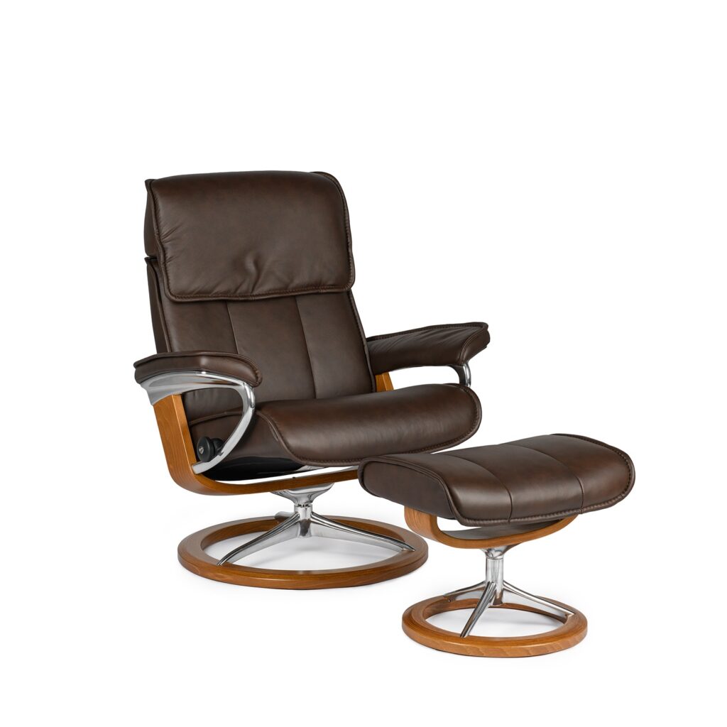The Admiral Medium Chair & Ottoman, designed by Ekornes of Norway, has a classic design with cutting edge comfort technology. Available with a signature teak base and chocolate Paloma leather upholstery, this piece provides full-body support, with an ample pillow-like headrest, and matching stitching. Admiral is equipped with Stressless® Plus™ and Glide Systems, which allow the chair to provide continous support for the head and lower back, while also adjusting the reclining angle based on shifts of the body. The Signature base brings the comfort of the BalanceAdapt™ system, which equips the chair with a gentle rocking motion to adjust with shifts in body position.