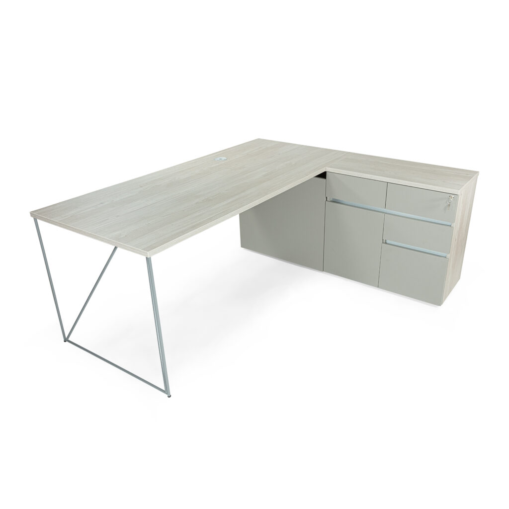 [0] => air desk with cabinet to right when seated. desk top and cabinet case in grey wood laminate d5. drawer fronts cubnait grey n2. ncss6500 grey metal parts. cable port cover in metallic (m) 70.8x62.9x29h