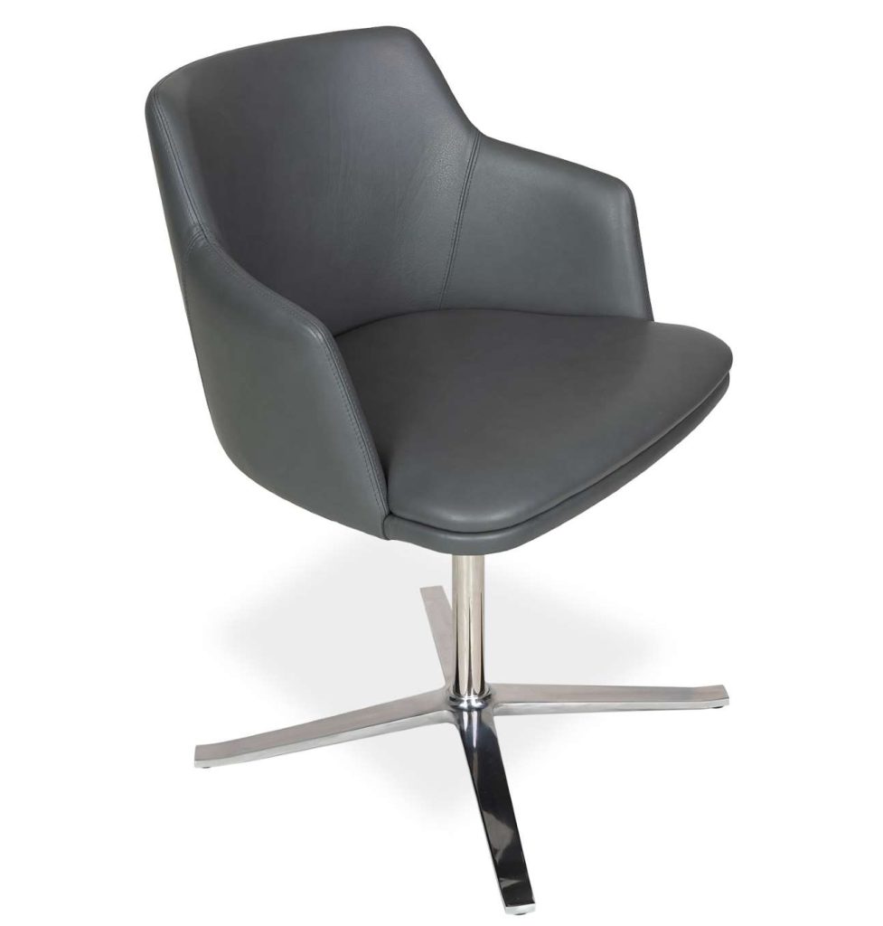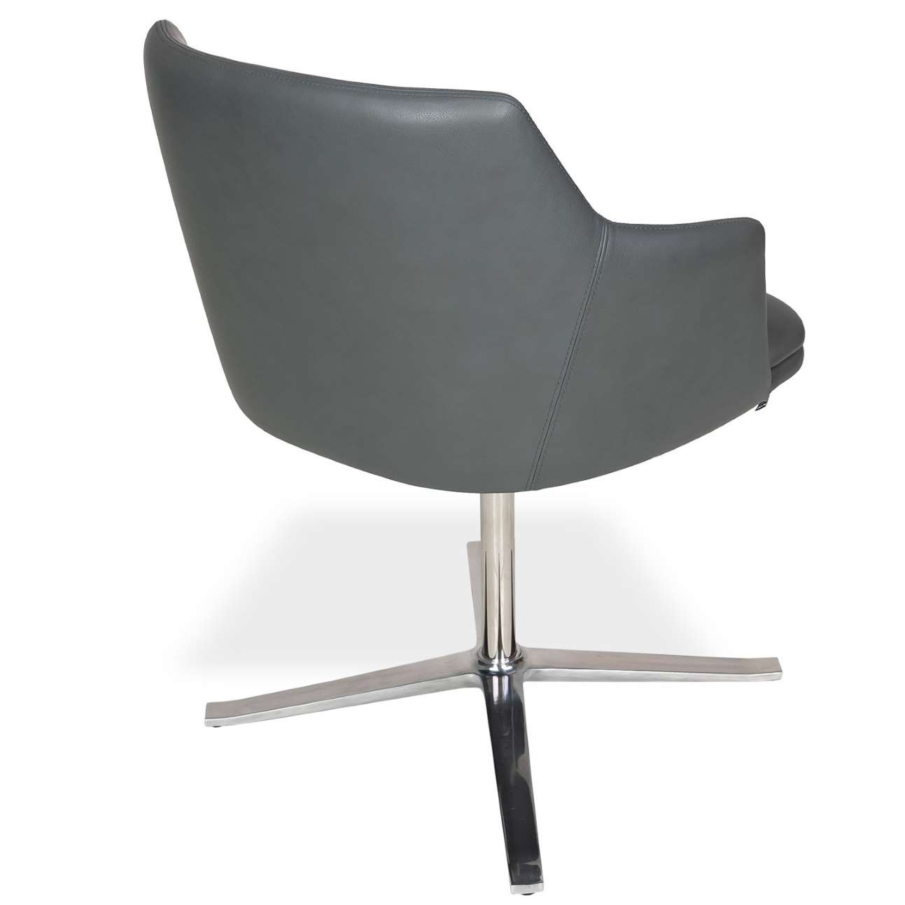 The Aksel Swivel Chair, upholstered in anthracite leather, is designed to conform to the curves of your body comfortably. A glossy aluminum star base tapers out into four sleek legs, while matching stitching highlights the angles of the chair.
