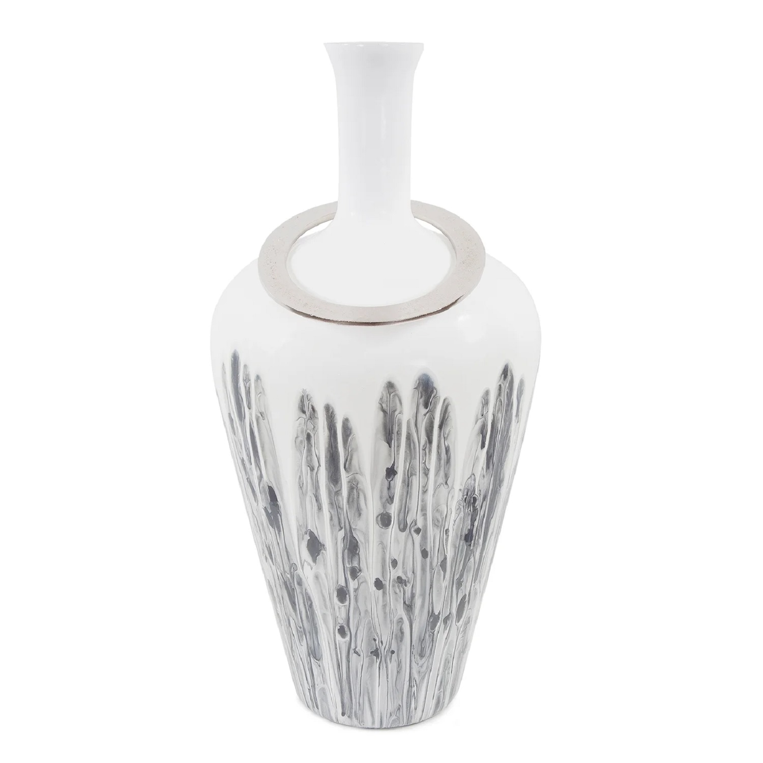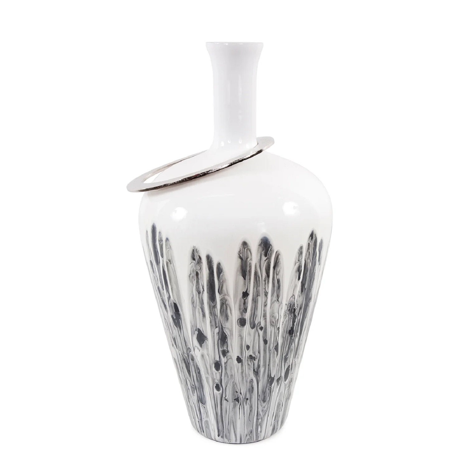 [0] => The Large Albrecht Vase is made of glass with a white finish and a grey pattern on its lower half that resembles flowing liquid. The narrow neck of the vase shows off an oval-shaped aluminum ring, a uniquely edgy addition that is sure to invite a closer look. Pair with the Medium Albrecht Vase or display on its own for a one-of-a-kind accent.