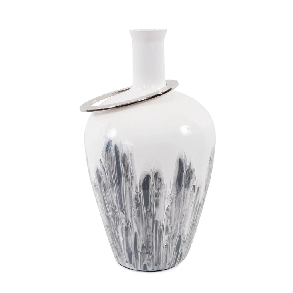 [0] => The Medium Albrecht Vase is made of glass with a white finish and a grey pattern on its lower half that resembles flowing liquid. The narrow neck of the vase shows off an oval-shaped aluminum ring, a uniquely edgy addition that is sure to invite a closer look. Pair with the Large Albrecht Vase or display on its own for a one-of-a-kind accent.