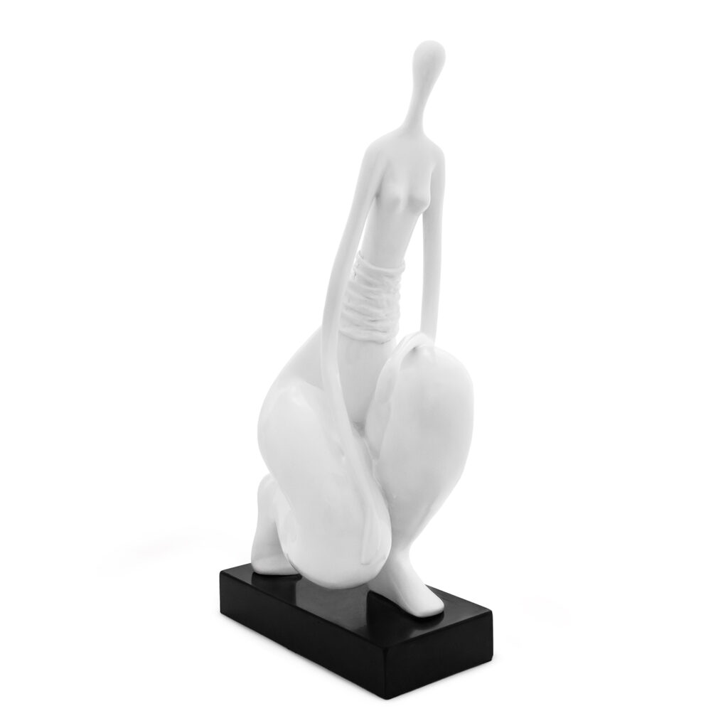 The Alice Sculpture has a minimalist, monochromatic design and features a glossy white figure kneeling on a thick black base. This piece combines rigid lines with natural curves of the body, and is both eye-catching in its movement and in its chic simplicity.