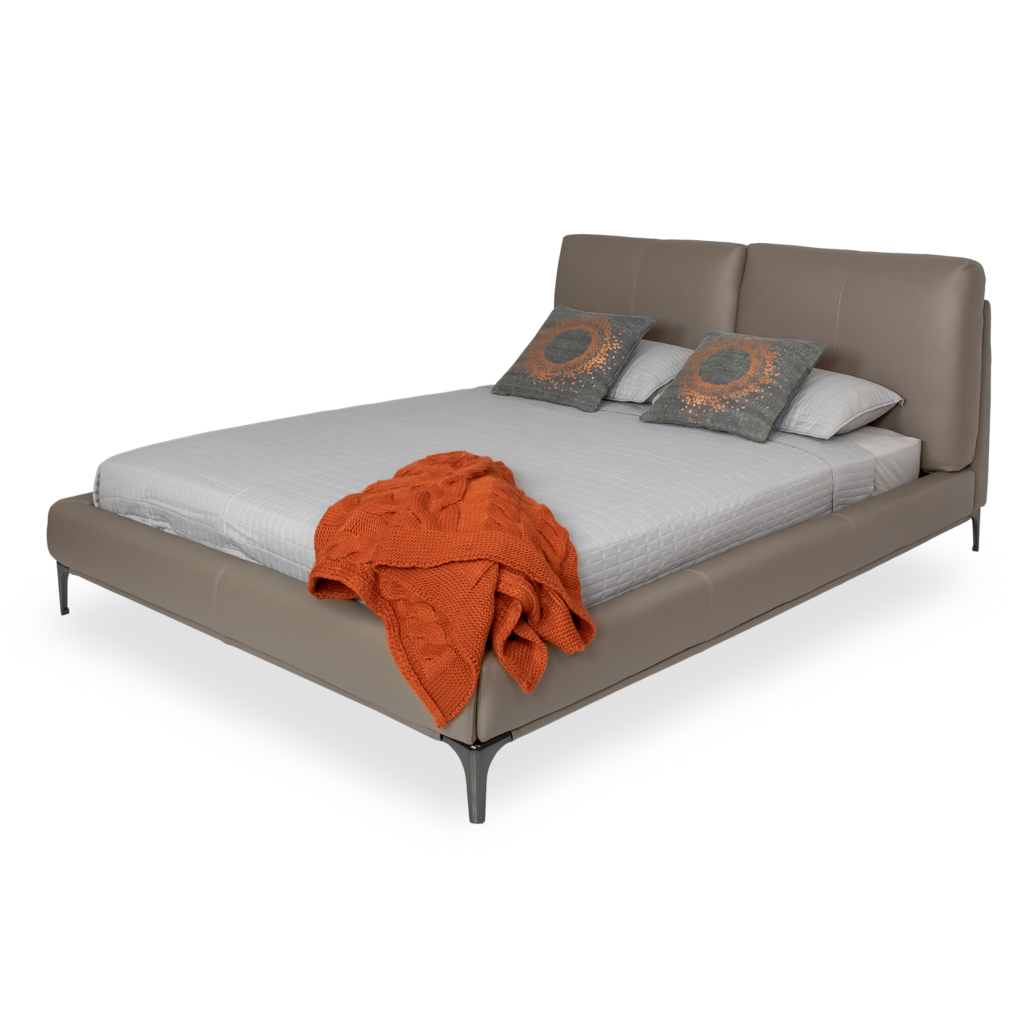 The Allure Queen Bed is inviting and luxurious, featuring protected leather upholstery in an earthy and versatile pine bark color. Allure's headboard is composed of two large cushions, each with accent stitching down the middle, that provide ideal backrests for reading or watching a show in bed. The lower frame is supported by dark grey metal legs and clad in the same leather as the headboard for a continuous look that will make you feel surrounded by comfort.