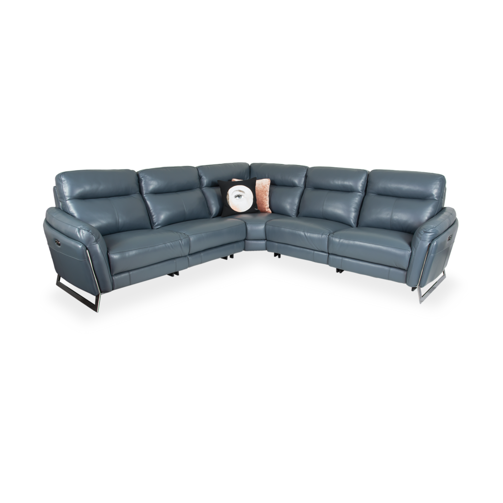 [0] => The Amanda Power Motion Sectional has a modern style and plush feel. Amanda's ocean leather upholstery adds a deep blue hue to your living space, while being subtle enough to complement colors in any design environment. Three power motion reclining seats are adjustable via buttons on either end of the sectional, with the third set concealed between the side-by-side reclining seats. Black nickel-plated legs offer additional support to the angled arms.