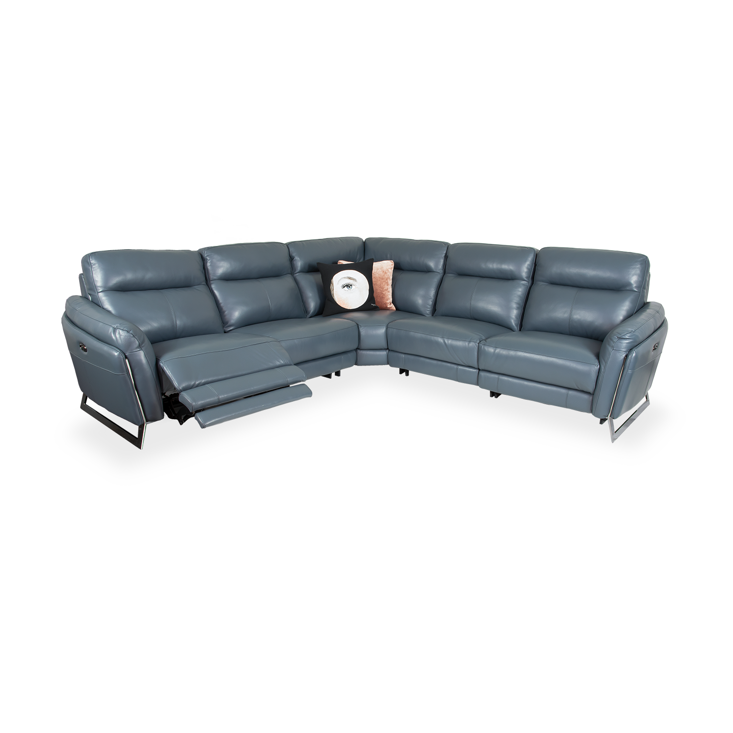 The Amanda Power Motion Sectional has a modern style and plush feel. Amanda's ocean leather upholstery adds a deep blue hue to your living space, while being subtle enough to complement colors in any design environment. Three power motion reclining seats are adjustable via buttons on either end of the sectional, with the third set concealed between the side-by-side reclining seats. Black nickel-plated legs offer additional support to the angled arms.