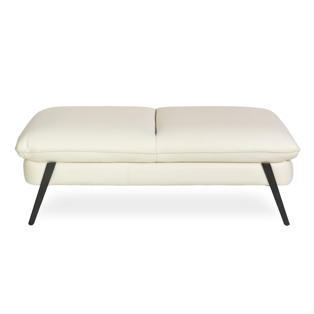 Upholstered in light beige Klimt leather, the Amelia Ottoman features soft, oversized cushions, inverted seams, and angled black legs that add a sharp, contrasting accent. Pair this ottoman with a sofa, loveseat, or sectional for a comfortable place to put your feet up, or place it on its own for casual accent seating. Amelia's neutral color will complement a variety of design schemes while its plush, layered look will infuse any space with a welcoming vibe.