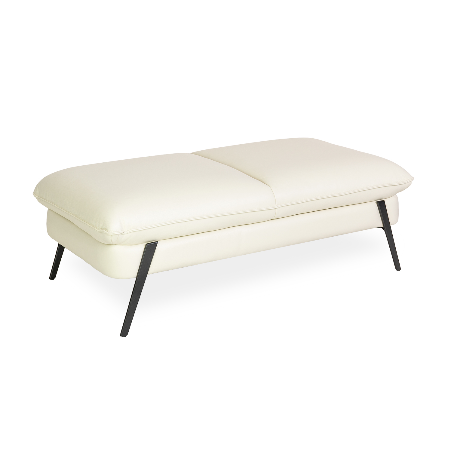[0] => Upholstered in light beige Klimt leather, the Amelia Ottoman features soft, oversized cushions, inverted seams, and angled black legs that add a sharp, contrasting accent. Pair this ottoman with a sofa, loveseat, or sectional for a comfortable place to put your feet up, or place it on its own for casual accent seating. Amelia's neutral color will complement a variety of design schemes while its plush, layered look will infuse any space with a welcoming vibe.