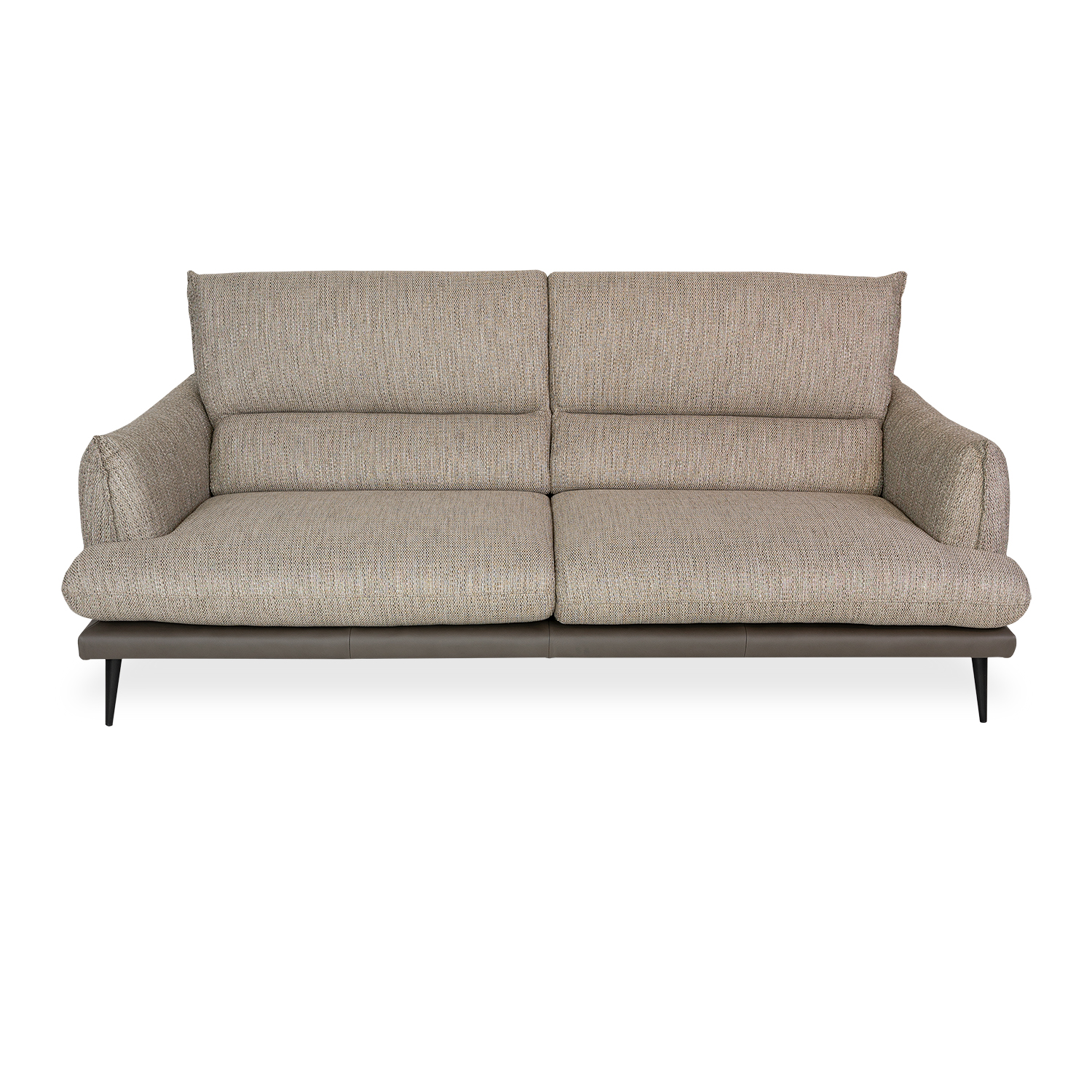 Designed by Egoitaliano, the Andria Sofa features beige-grey fabric upholstery, a matching base in grey leather, and a contemporary design with playful touches. The wide, tufted seat cushions extend beyond the line of the armrests for a casual look, while curved stitching and inverted seams on the arms and back add unique accents. Andria stands on angled metal legs with a matte black finish and is sure to add personality to any modern living room.