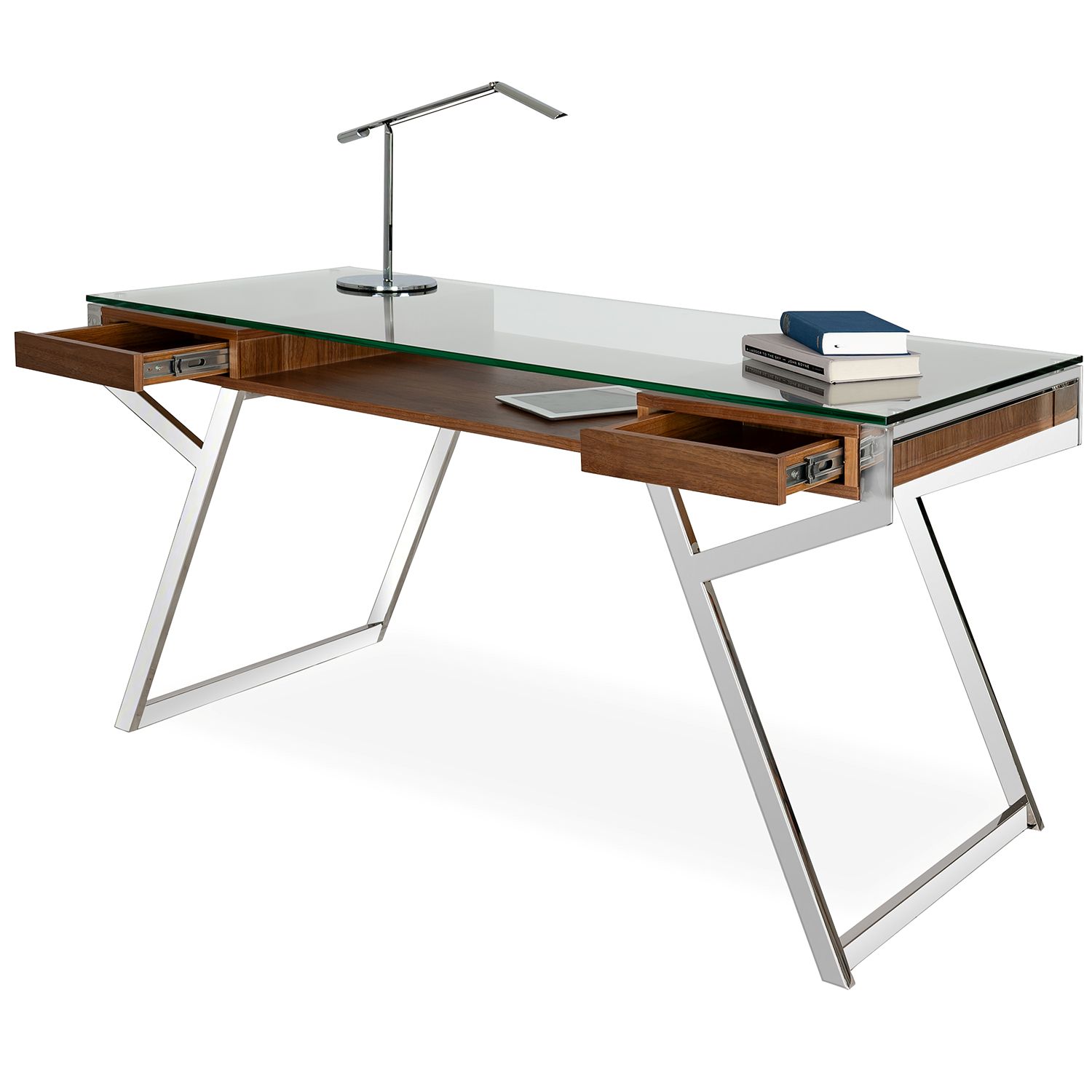 The Aragon Desk, available with a clear glass top and walnut finish, is a simple, elegant desk with clean lines and a uniquely shaped metal frame with angled elements. Aragon has two drawers for convenient storage, and a spacious open storage compartment underneath the glass desktop.