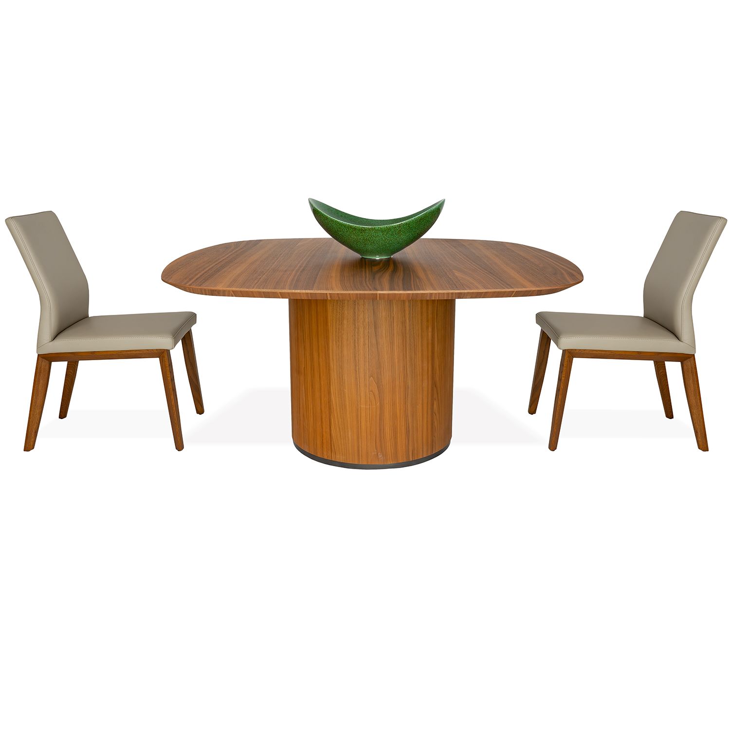 Bring mid-century modern style to your dining space with the Aristo Dining Table. Made of wood with a walnut finish and silky-smooth feel, this table has a rounded square top with a beveled edge and seats 4 to 6 diners. The thick cylindrical base with a space grey metal accent evokes the gravitas of a tree trunk. The Aristo will bring a classic look and substantial presence to any dining occasion.