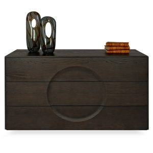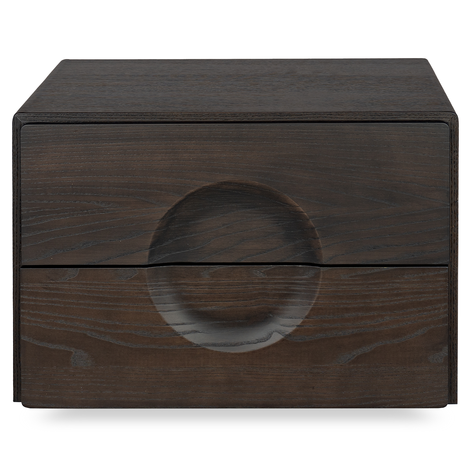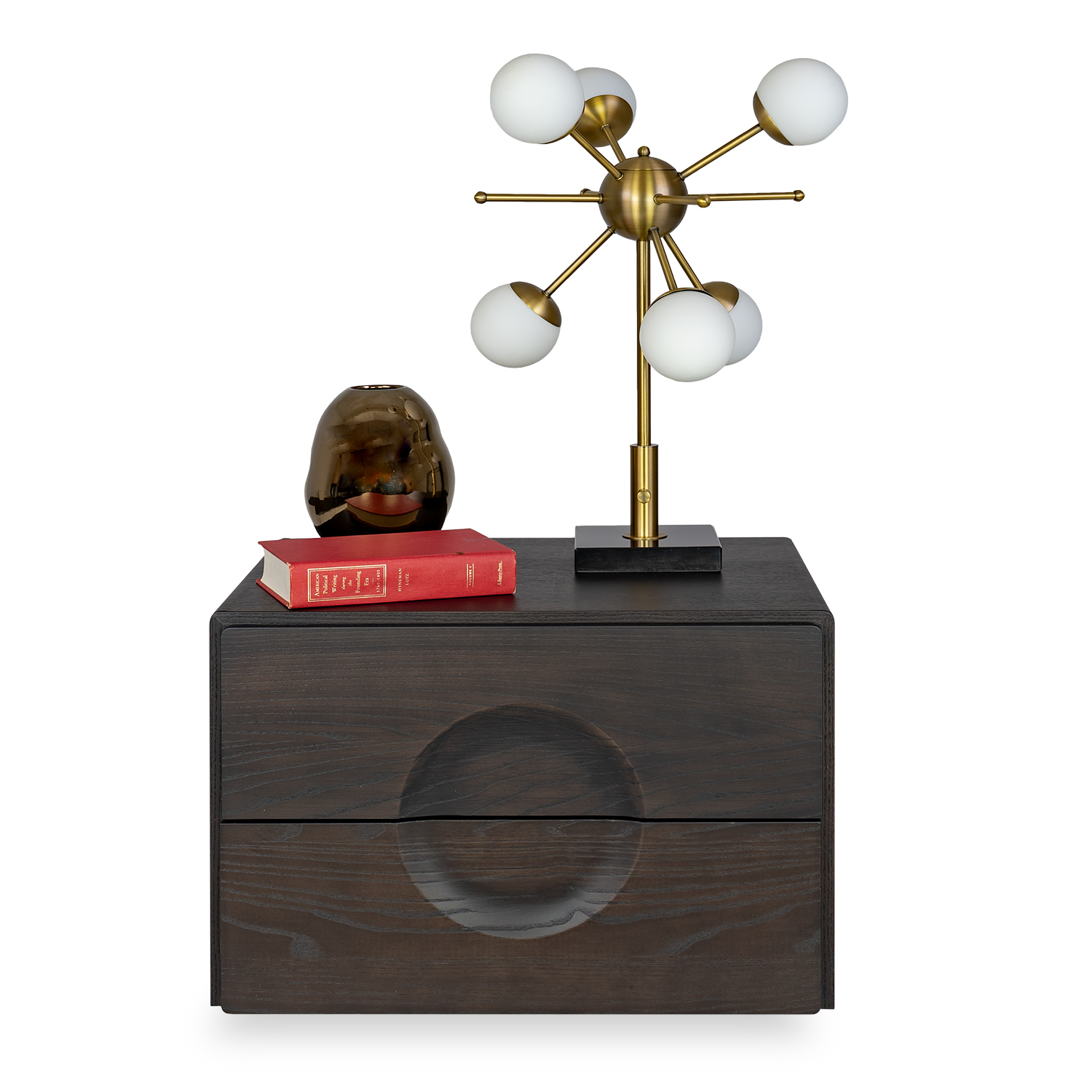 Made in Italy, the Armadi Bedside Table combines a clean look with a one-of-a-kind accent. Armadi is crafted of ash wood with a dark brown finish, and has a circular impression carved smoothly across its two front drawers in a continuous shape. The push-to-open drawers offer plenty of space to store bedside necessities, while discreet legs provide support. Rounded top corners form a visual complement to the circular shape below.