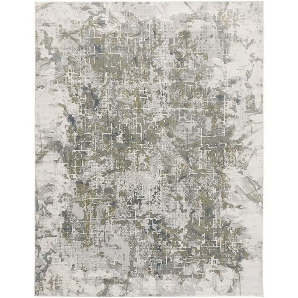[0] => Inspired in equal part by ethereal landscapes and geometric cityscapes, the Atwell Rug boasts a pattern in muted tones of green, blue, and ivory. A delicate gridded design shows through patches of subdued color, providing a striking sense of contrast and visual depth. Power-loomed in Turkey from polypropylene, Atwell has a durable construction ideal for high-traffic areas.