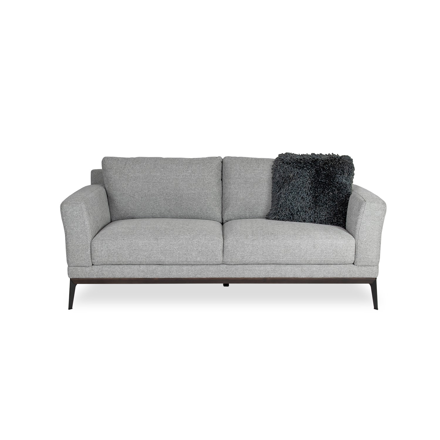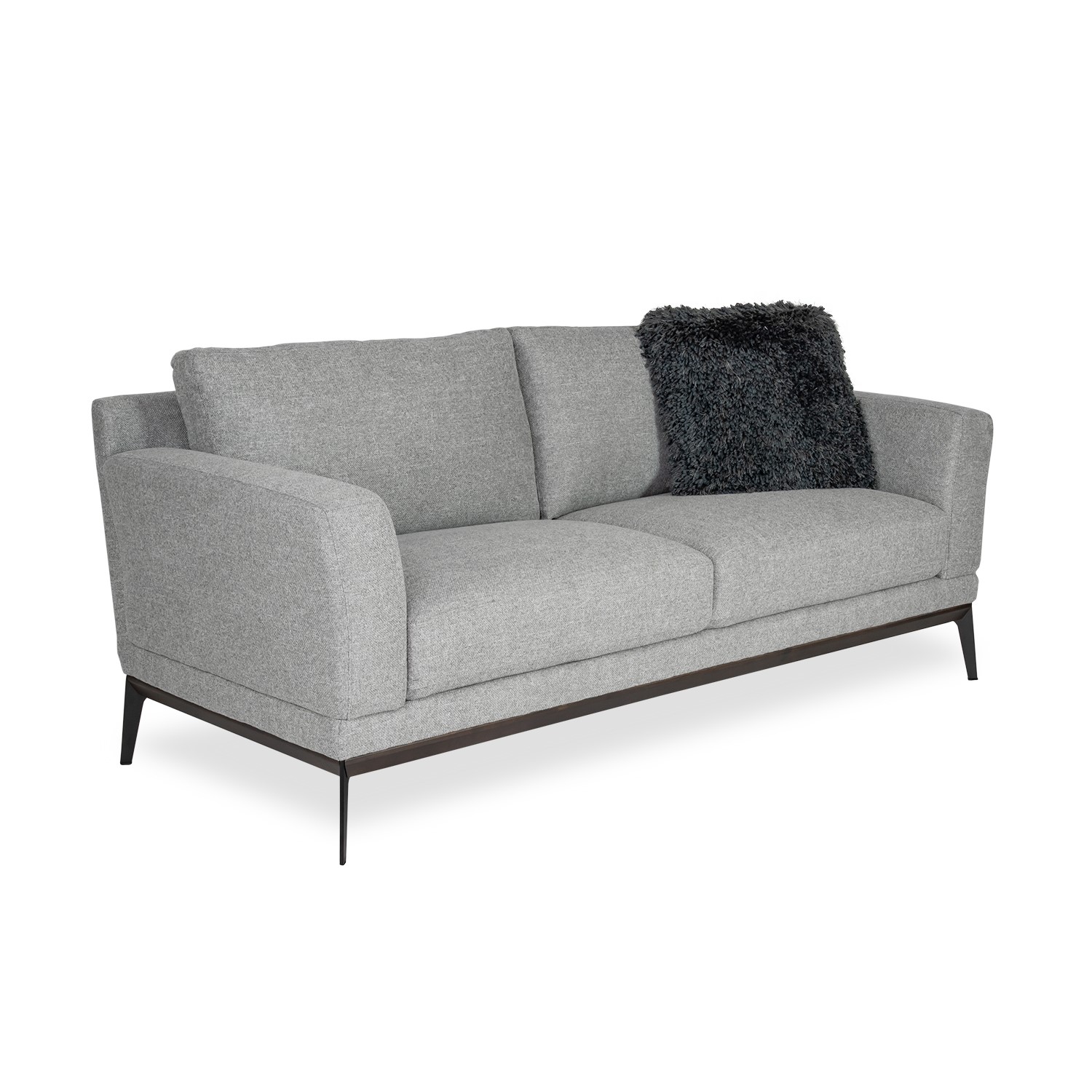 The Austin Sofa has a clean, contemporary look, with two wide seats, curved armrests, and Feliz fabric upholstery in ash grey. The wood trim adds a warm contrast to the cool tones of the fabric and angled black legs, and the flared armrests offset the straight lines of the base and back. Austins understated design and neutral tones can fit into a wide variety of design environments.
