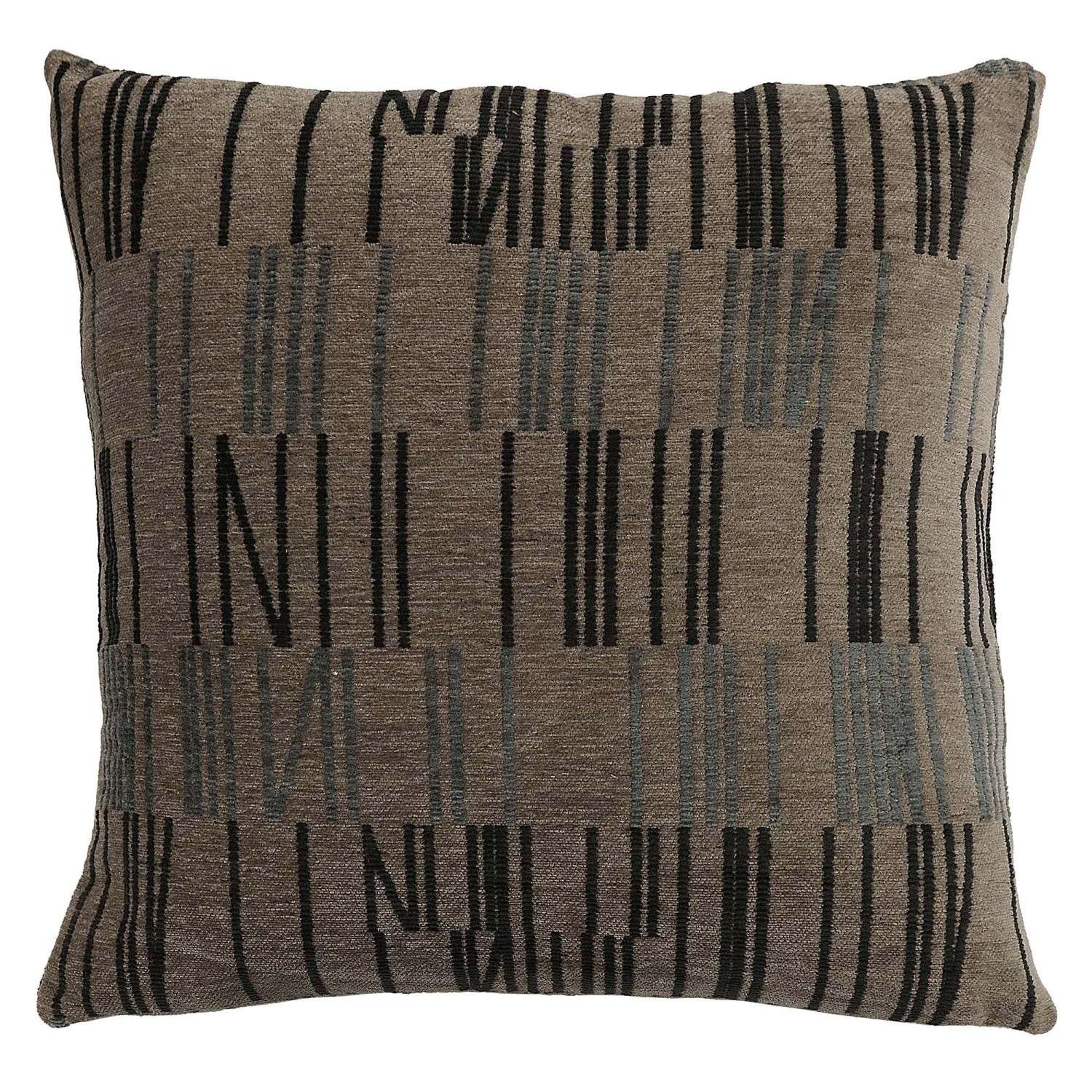The Barcode Pillow features a neutral shade of fossil grey and a velvety cover woven from polyester. Sections of irregularly spaced vertical lines in dusty blue and black evoke the patterns of barcodes. A feather filling gives this pillow a satisfying plumpness, while a discreet zipper allows the cover to be removed for spot-cleaning if needed.