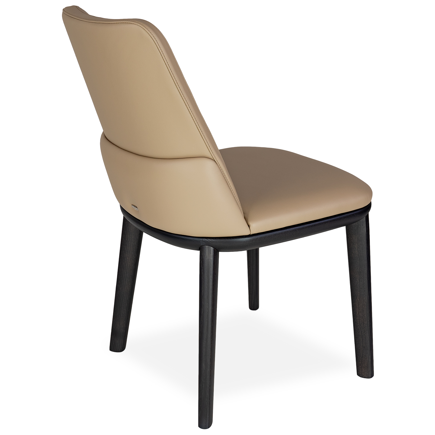 The Belinda Side Chair, designed by Paolo Cattelan, blends high quality materials with luxurious, elegant design. Belinda has a tapered backrest with ample cushioning, plus a cushioned accent on its outer back side that enhances its comfortable look. The back and seat are upholstered in soft taupe leather, while the ash frame with rounded legs and a burned oak finish adds a contrasting hue.