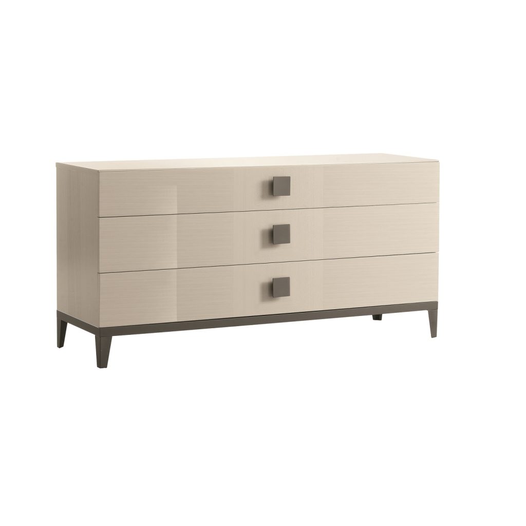 The Bella Avorio dresser, made in Italy, is elegant with sharp, clean lines and a beautiful ivory koto high gloss finish. The light, neutral gloss contrasts with the dark square metal drawer pulls and frame for added flair. This dresser has three long drawers, each of which is divided into two compartments for storage.