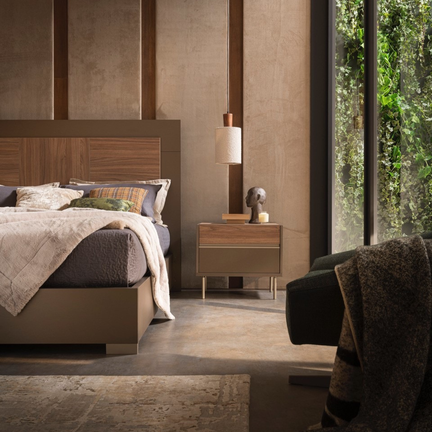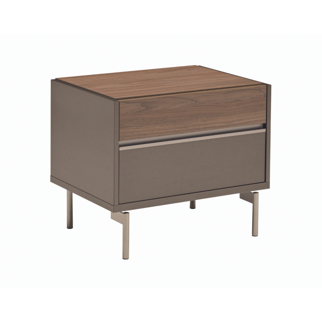 Understated and elegant, the Bella Borgata Nightstand will refresh your space with its light, airy design, earthy tones, and modern accents. Made in Italy, the nightstand has a tabletop and upper drawer finished in warm, eco-veneer walnut, with sides and a lower drawer in smooth matte bronze. The drawers are soft close and have integrated pulls for easy access to your nighttime essentials, plus an interior in textured dark grey wood. Slim bronze metal legs add a burnished metal accent and modern look. Cozy, woodsy, and warm, the Bella Borgata bedroom collection invites you to embrace true relaxation.
