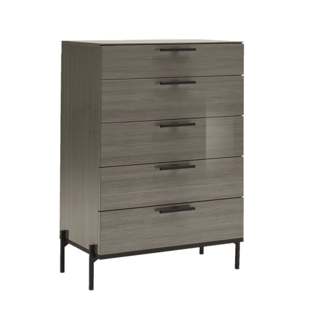 The Bella Centro High Chest features sleek, clean lines and a classic design. The glossy grey silverwood base is accented by matte black handles and legs, adding a sophisticated, cool-toned look. Five drawers provide ample storage space for your clothes and accessories, while the elegant frame brings timeless style into your bedroom.