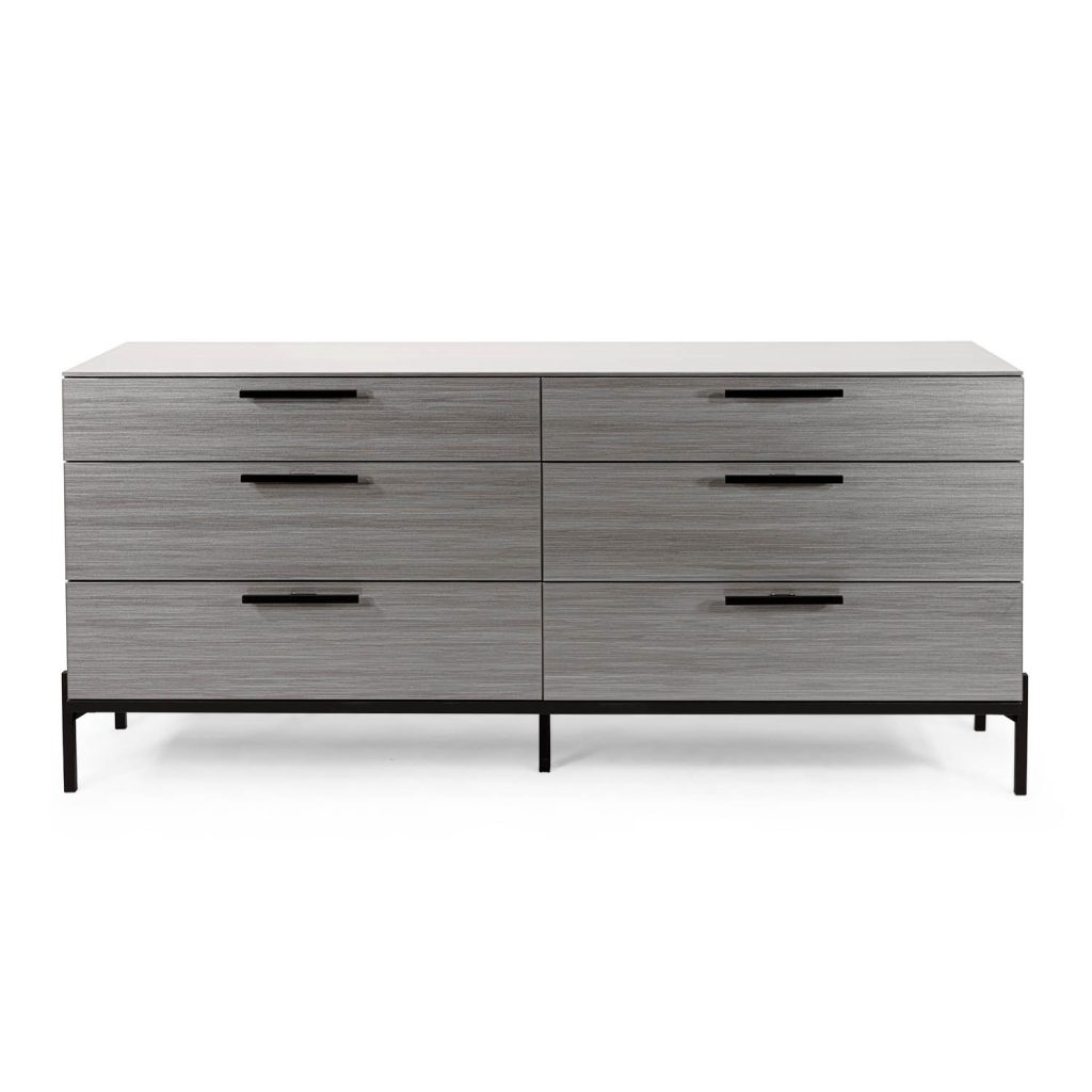 The Bella Centro Dresser features sleek, clean lines and a classic design. The glossy grey silverwood base is accented by matte black handles and legs, adding a sophisticated, cool-toned look. Six drawers provide ample storage space for your clothes and accessories, while the elegant frame brings timeless style into your bedroom.