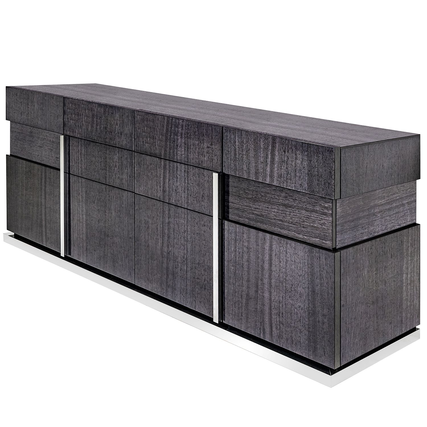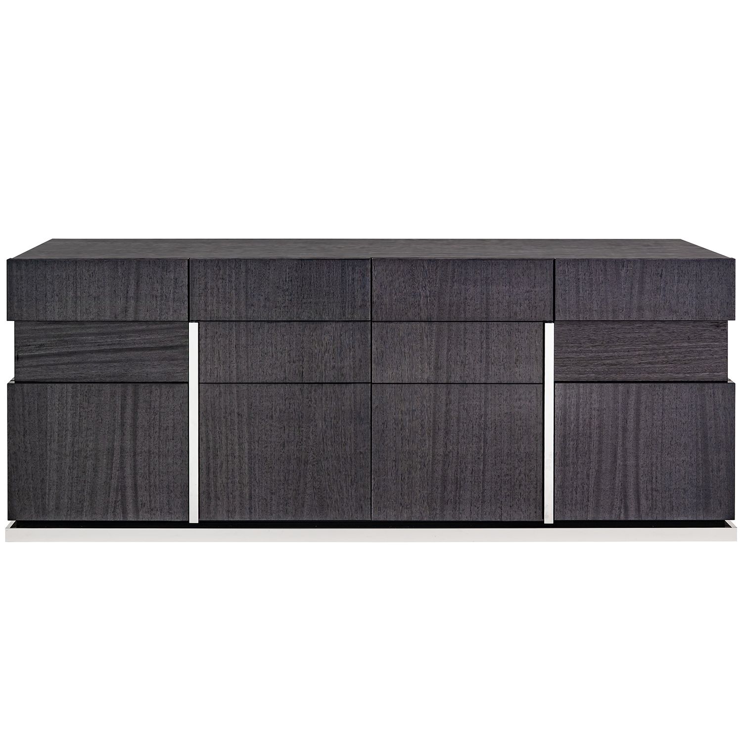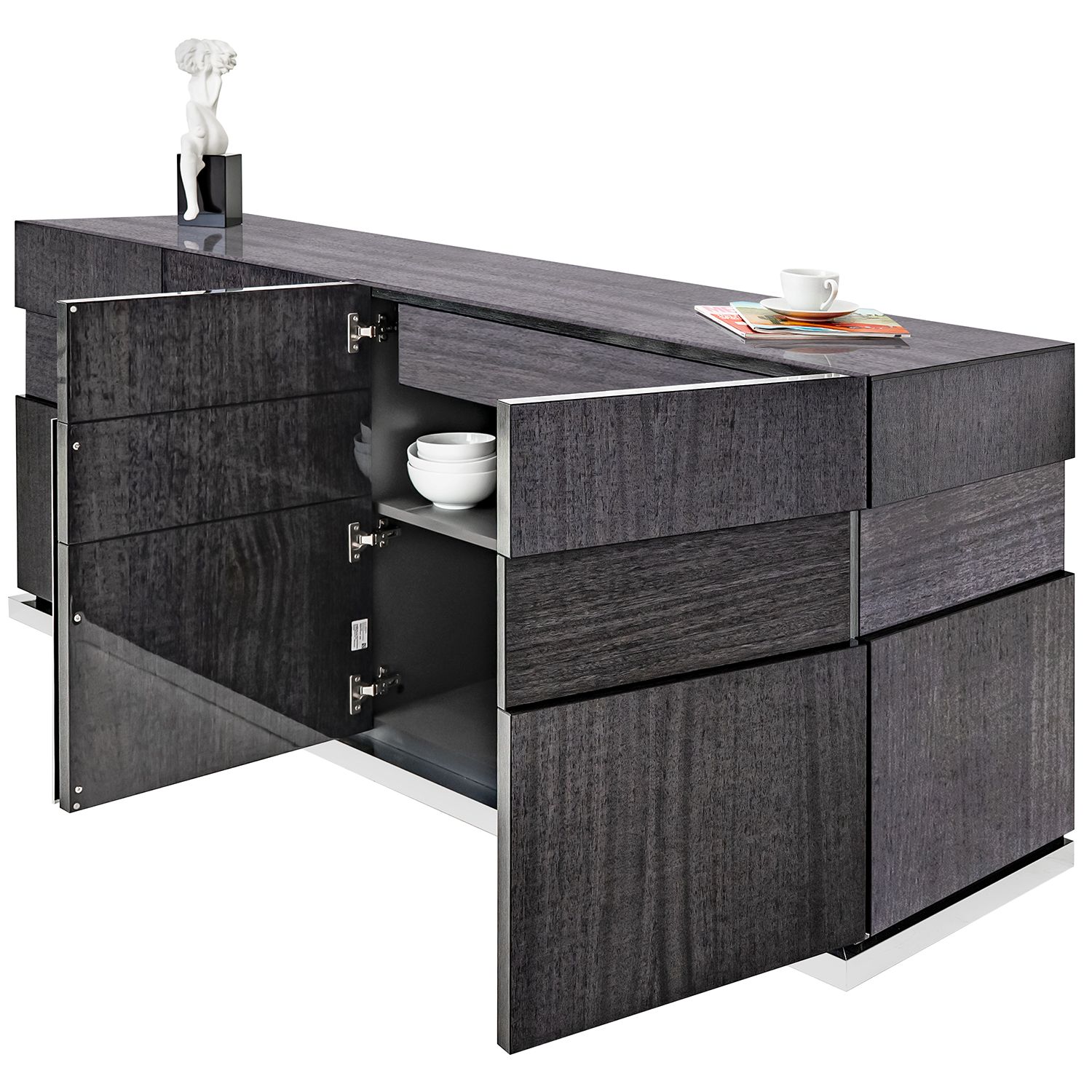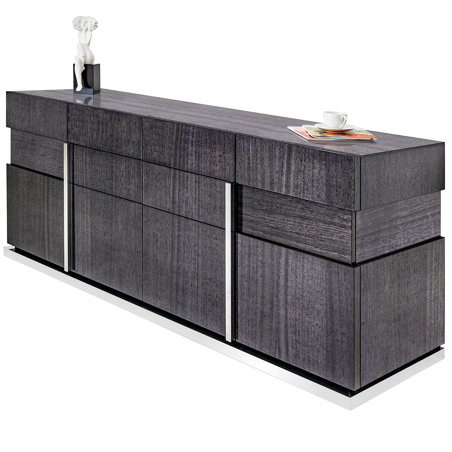 The Bella Grigio buffet, made in Italy, is an elegant buffet cabinet in high gloss grey koto wood. The buffet has four doors and ample storage for dishes, serveware, and linens.