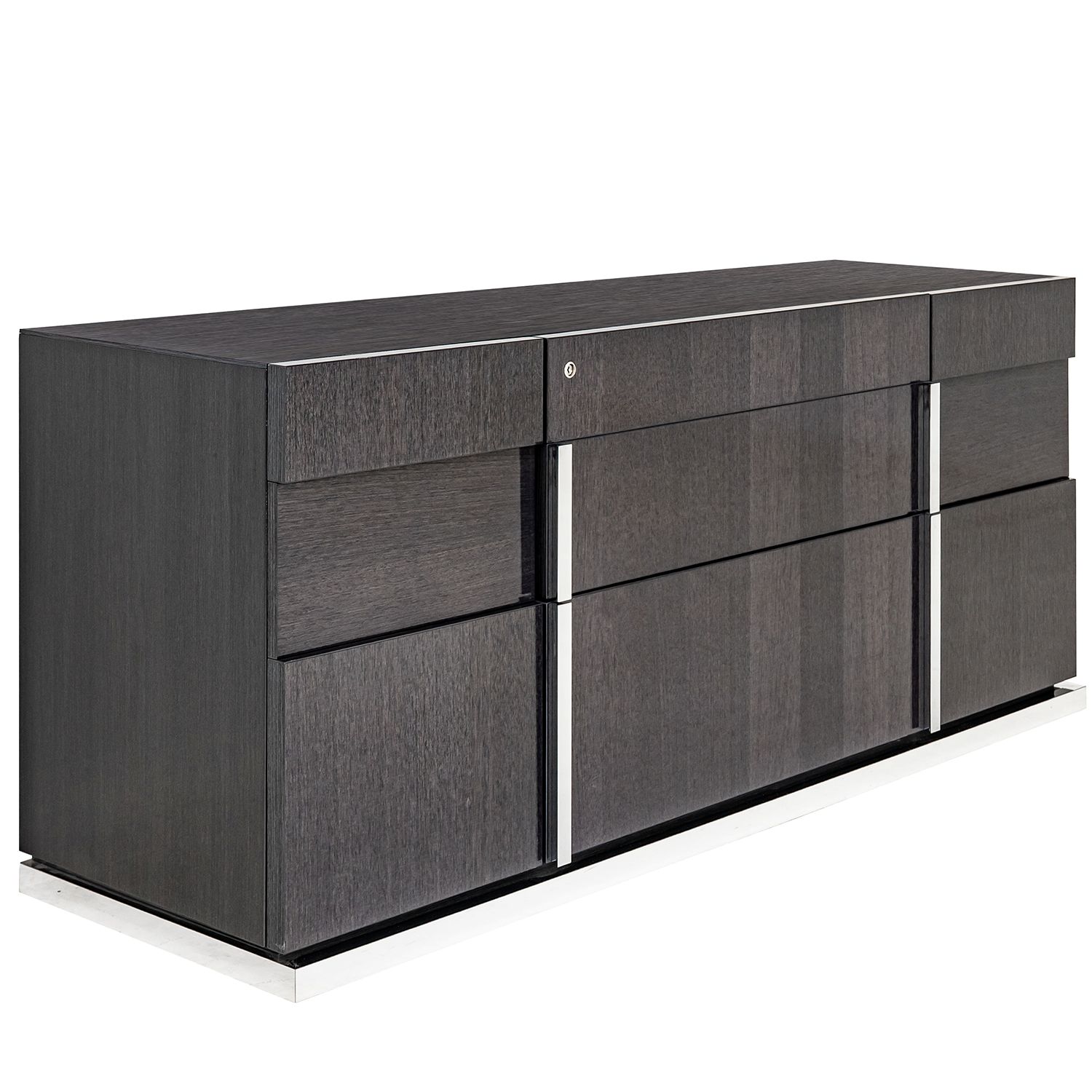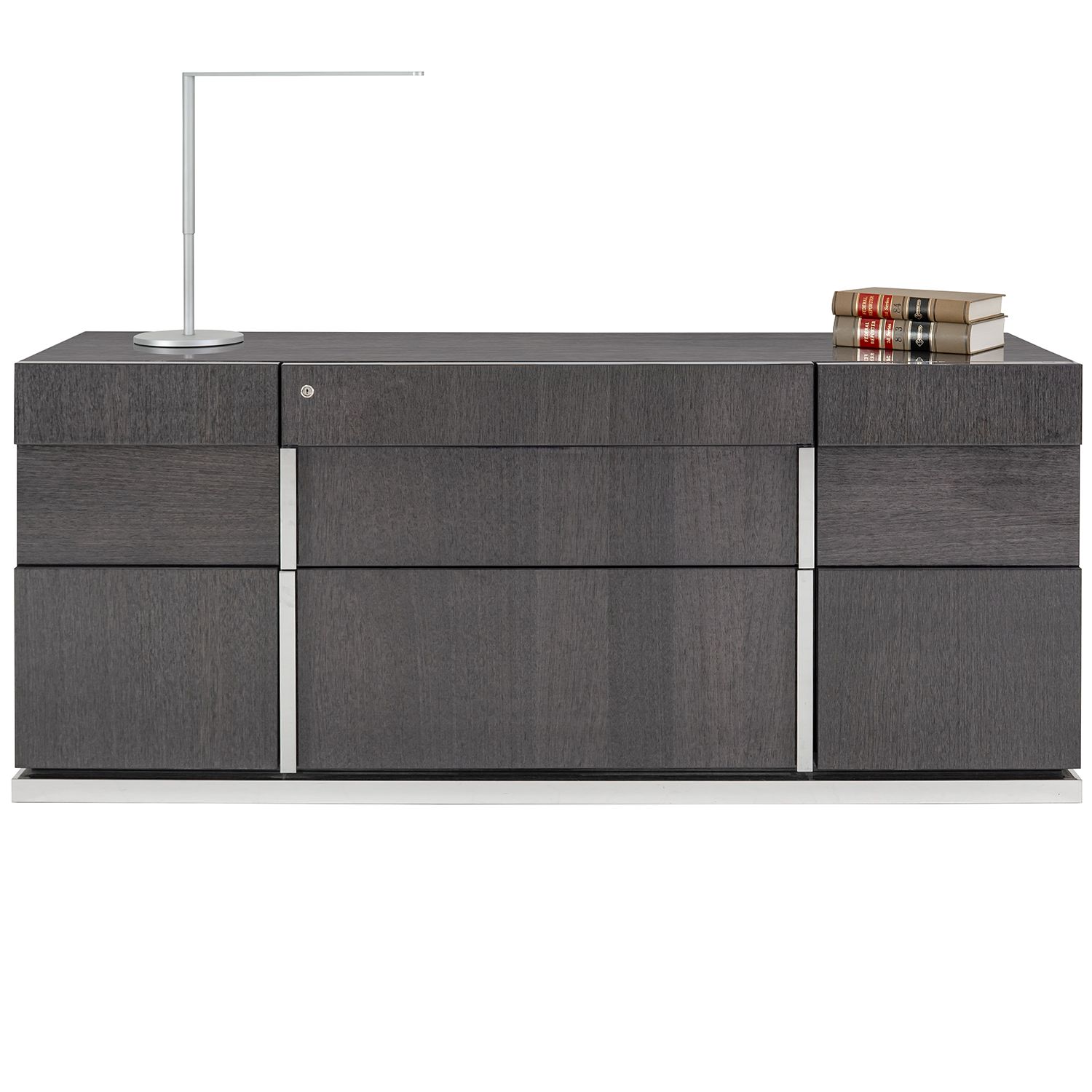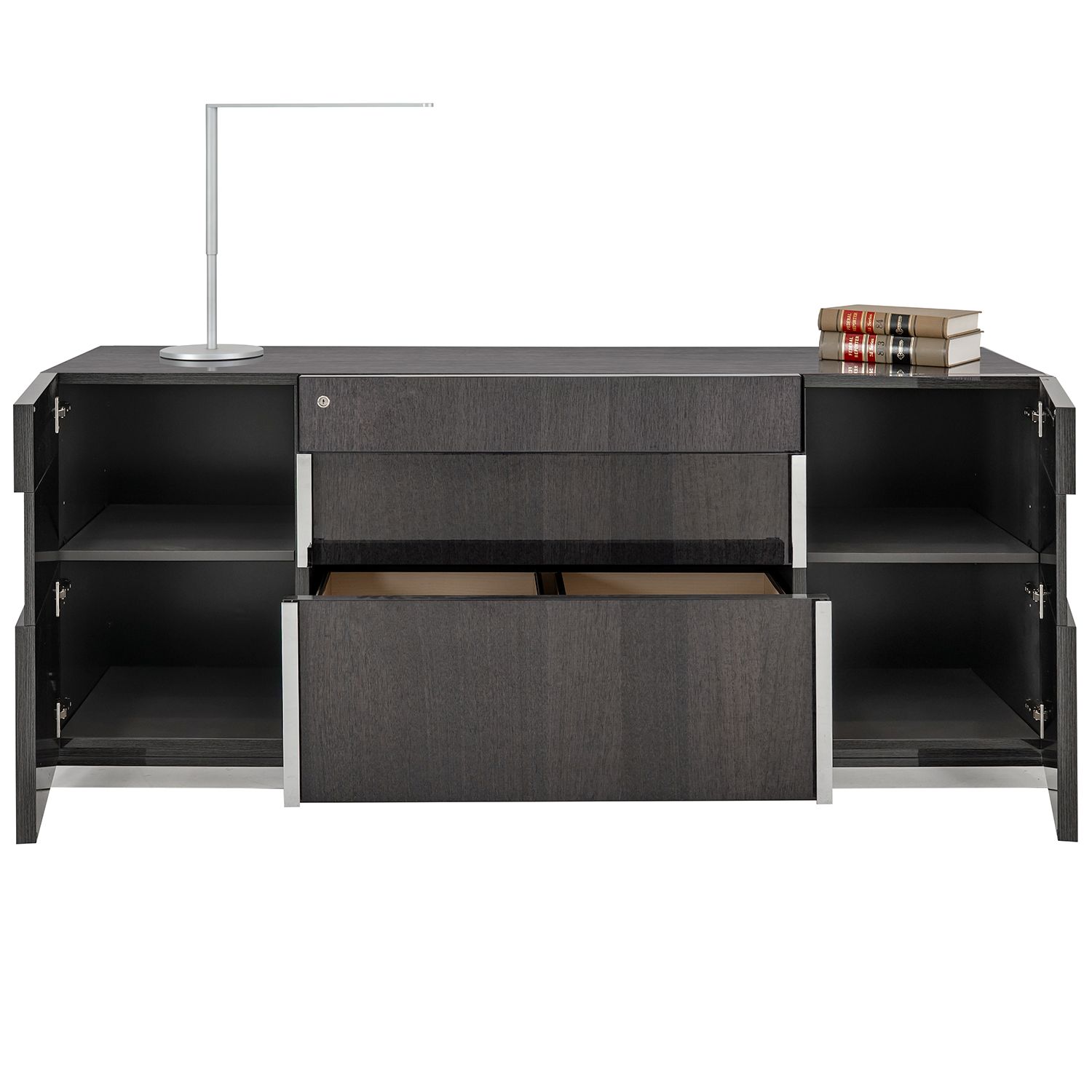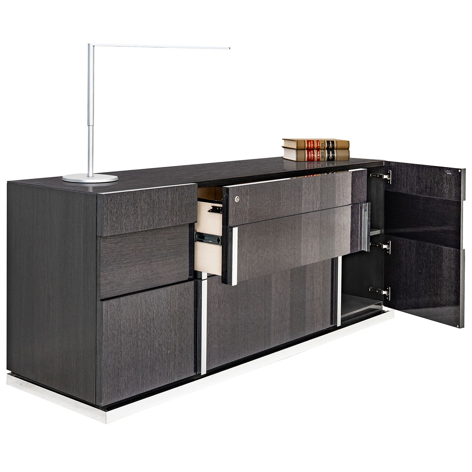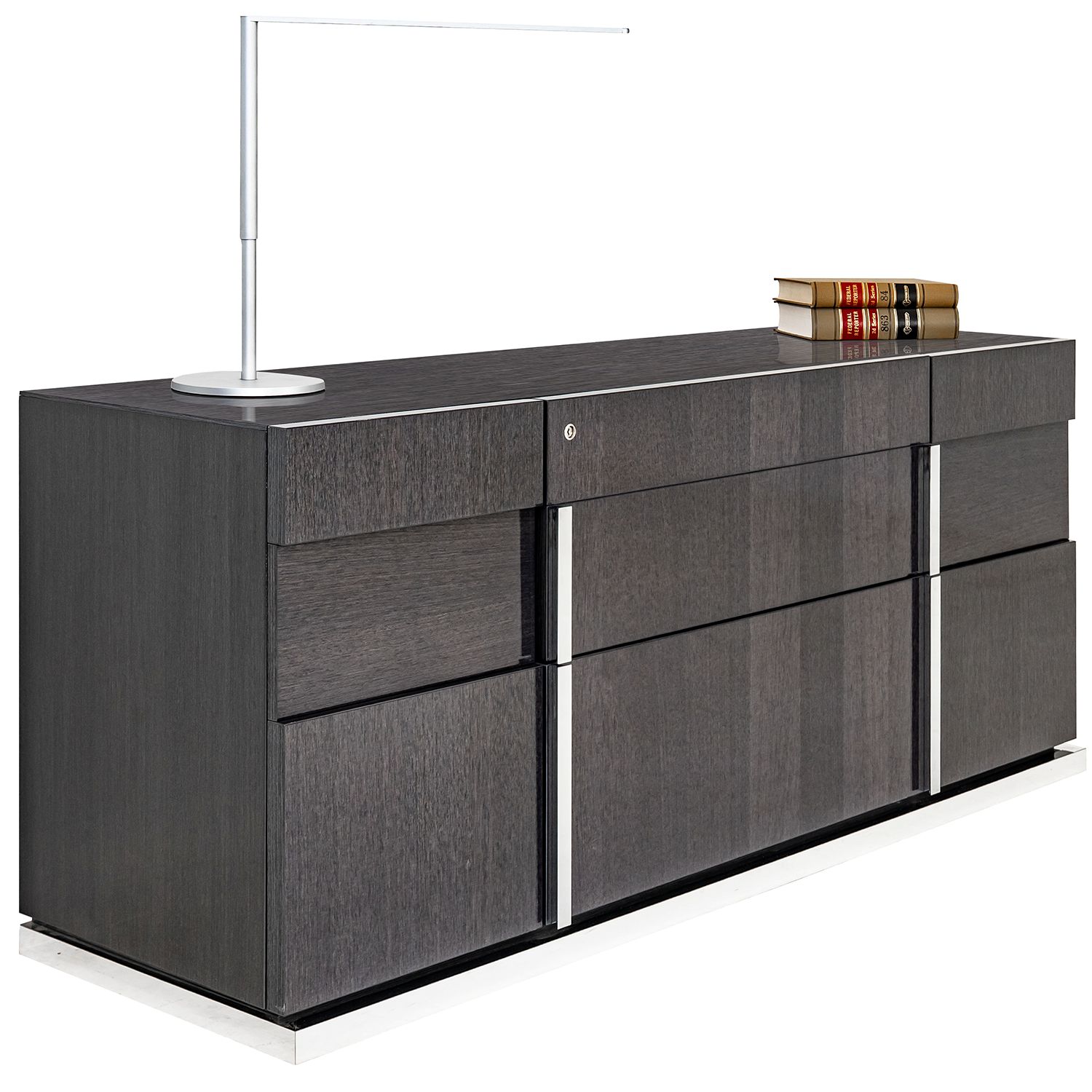 The Bella Grigio credenza, available in high gloss koto, is a beautiful office credenza with clean lines, sophisticated style, and ample storage.