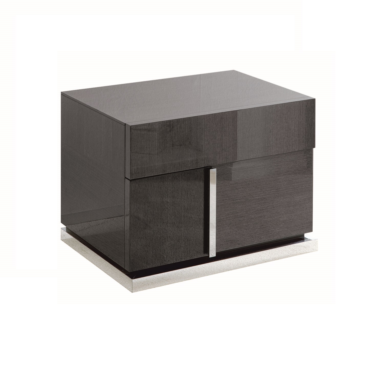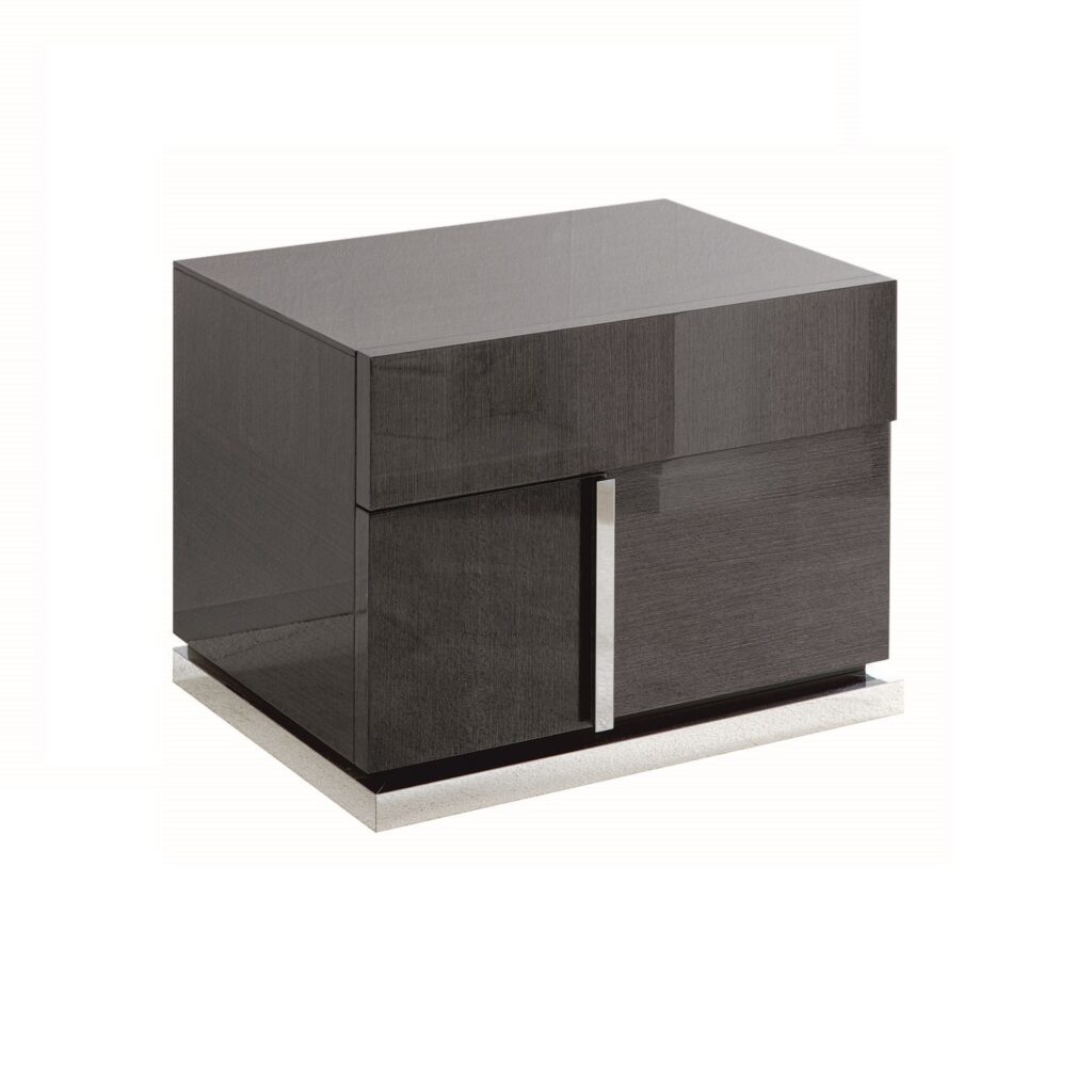 The Bella Grigio nightstand, made in Italy, is a stunning contemporary nightstand in high gloss grey koto wood. The nightstand has two spacious drawers and an eye-catching metal accent placed elegantly on the side. The Bella Grigio nightstand complements the Bella Grigio bed.