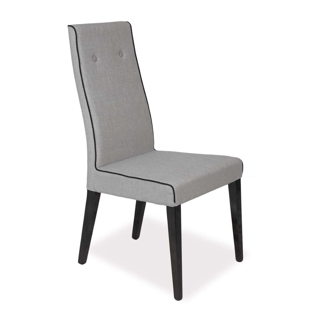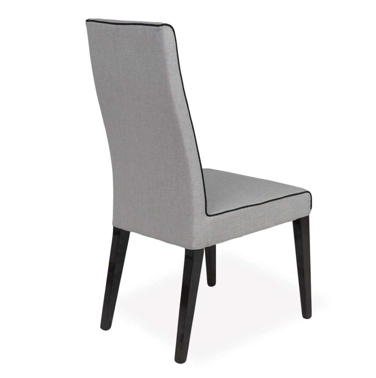 The Bella Grigio side chair features just a hint of transitional style while remaining thoroughly contemporary. The chair features sturdy solid wood framing with high gloss Koto stain over exposed wood legs. The fabric is grey with contrast piping.