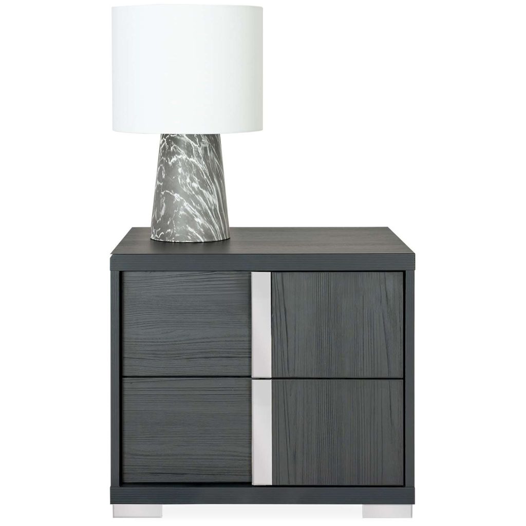 [0] => The Bella Luna nightstand, available in matte black pine with an eco-veneer finish, has a sleek, minimalist design with clean lines and beautiful style. An attractive metal accent runs down the center of each drawer, artfully concealing the drawer pull. The Bella Luna nightstand complements the Bella Luna bed.