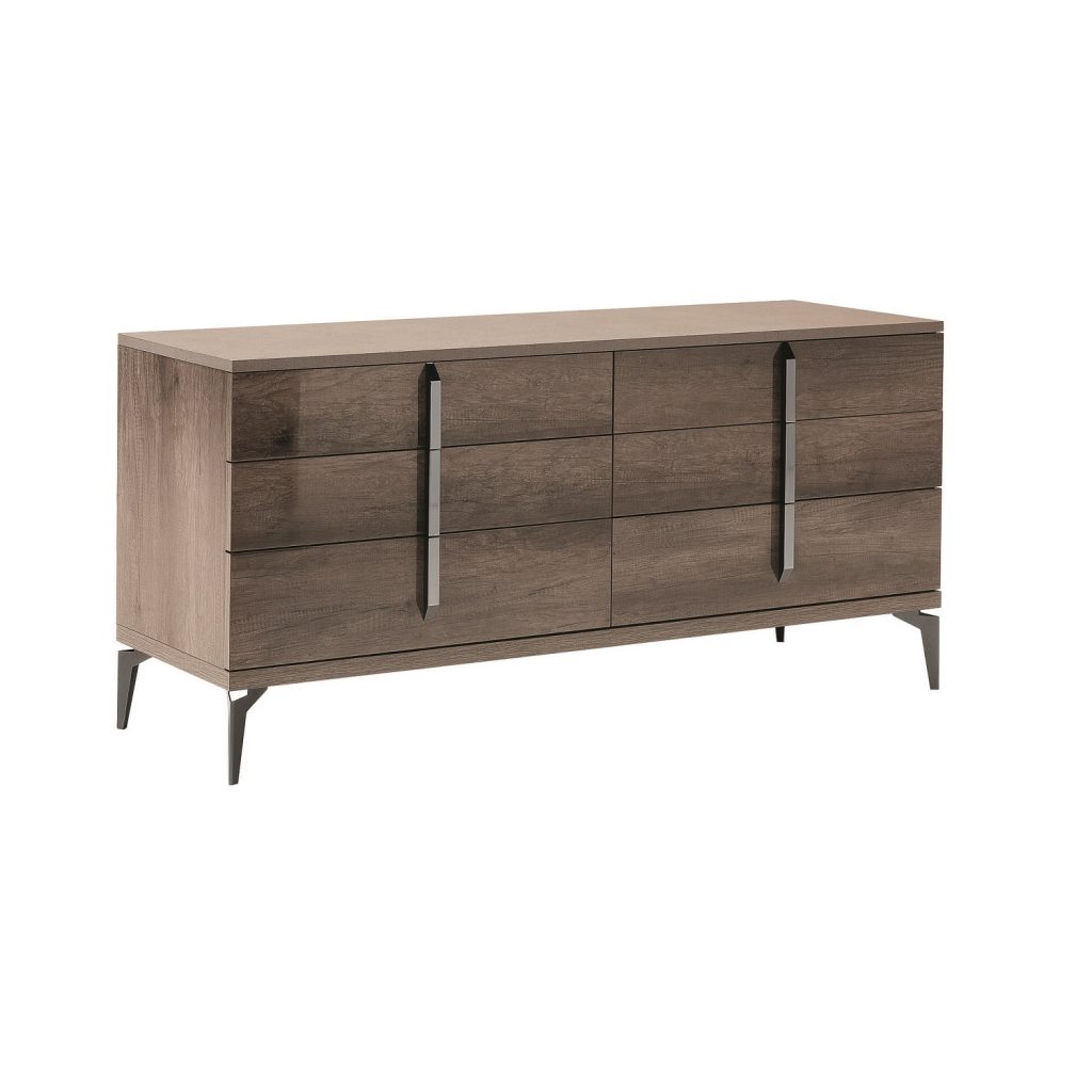 The Bella Nuova dresser features a glossy rim oak frame complemented by a matte brown top with a grained texture. This luxurious, contemporary dresser sports clean lines and attractive metal accents along the midline of the drawers. Made in Italy.