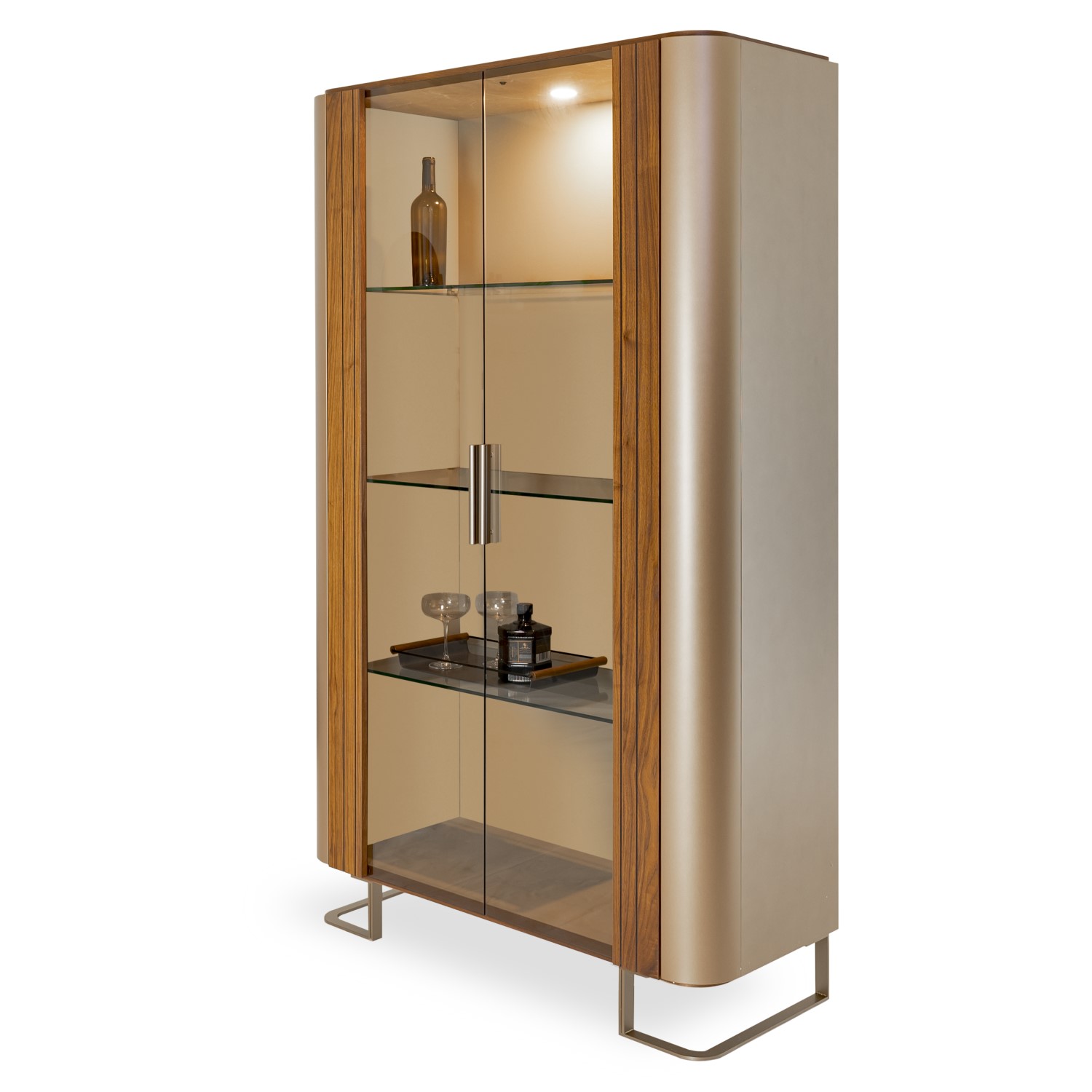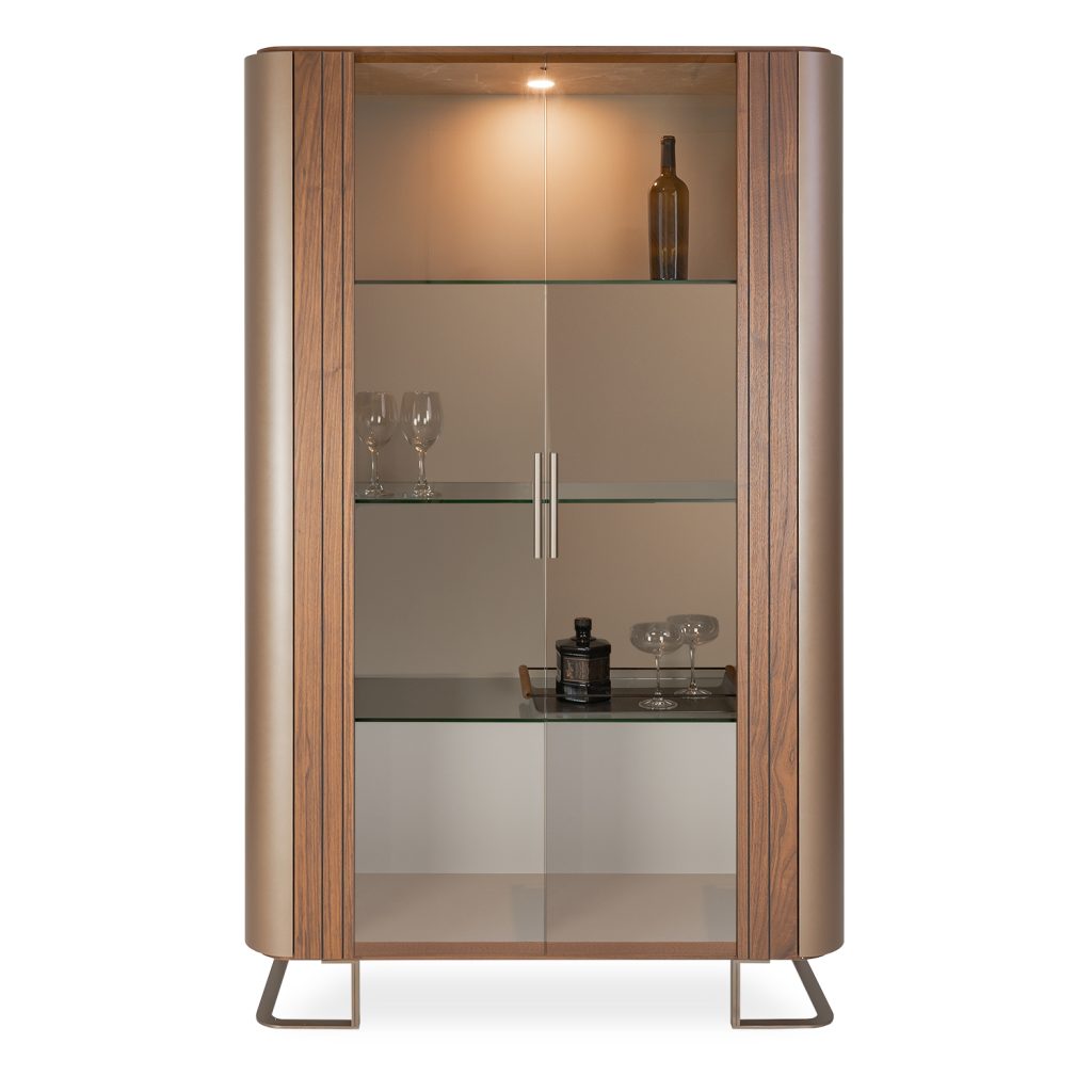 [0] => With its masterful blend of materials and textures, the Bella Ruggente Curio Cabinet embodies the pinnacle of contemporary luxury, with nods to mid-century modern design. This curio cabinet immediately catches the eye with its two front doors featuring clear glass and walnut veneered wood carved in irregular vertical channels. A stunning gold lacquer adorns the curved sides of the cabinet, and the top is finished in grey eco-stone with white veining for an opulent look. Four shelves lit by an LED light display your keepsakes in style, while metal legs with a unique rounded shape add the finishing touch to this sumptuous, Italian-made curio cabinet.