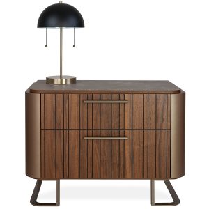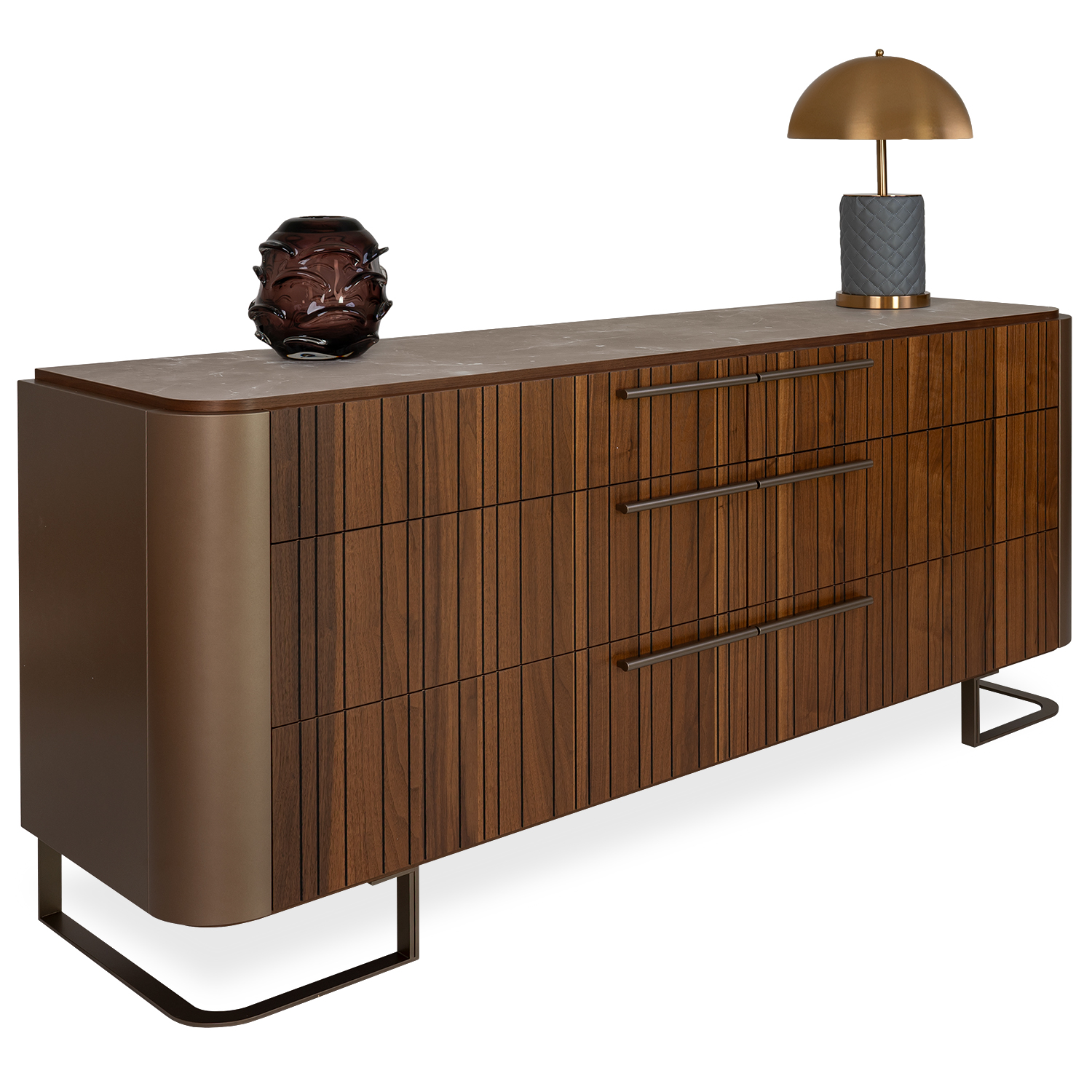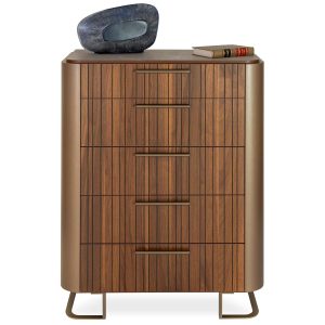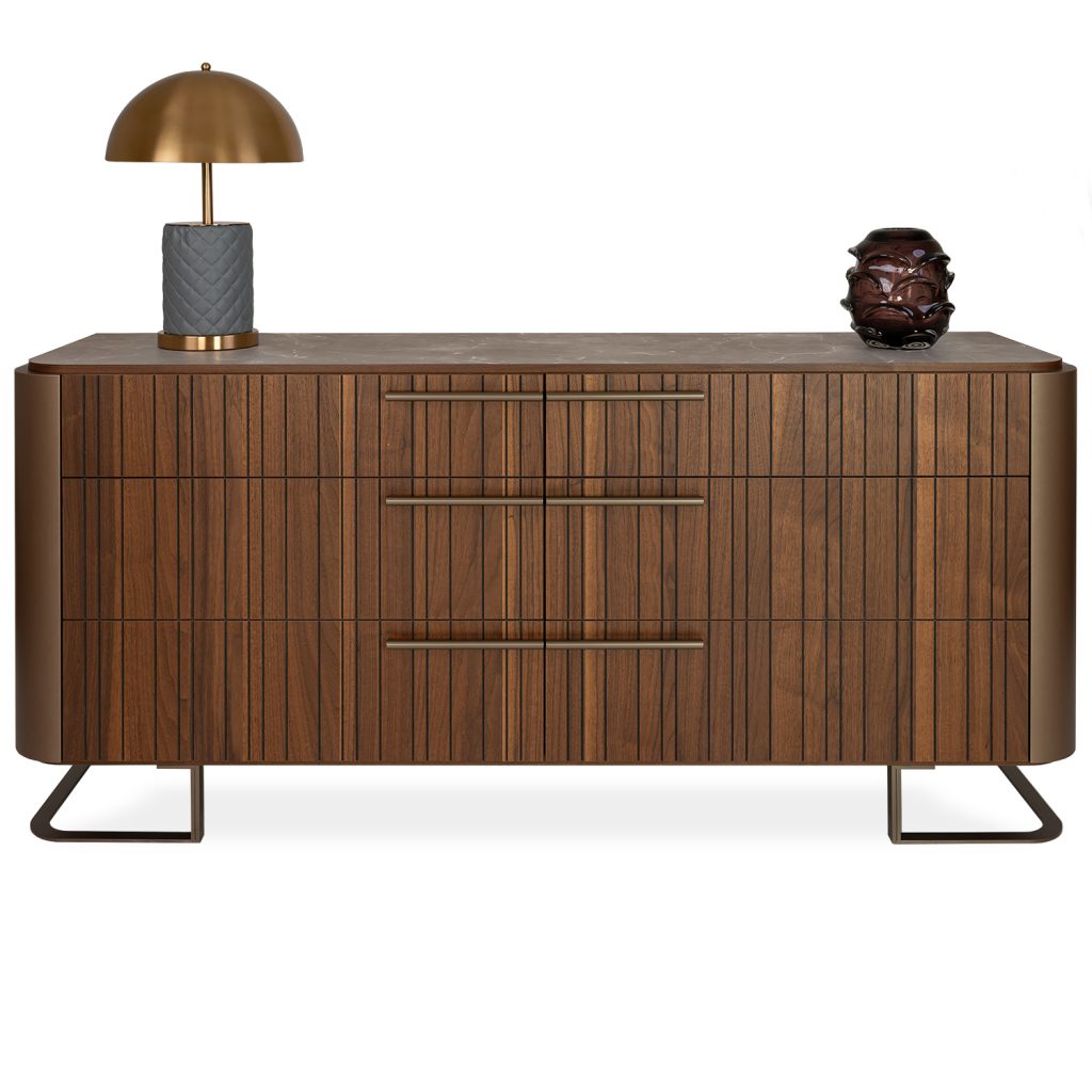 [0] => With its masterful blend of materials and textures, the Bella Ruggente Dresser embodies the pinnacle of contemporary luxury, with nods to mid-century modern design. Bella Ruggente's drawer fronts immediately catch the eye with their walnut veneer carved in irregular vertical channels. Gold lacquer adorns the curved sides of the nightstand, and the top is finished in grey eco-stone with white veining for an opulent look. Six soft-close drawers keep your wardrobe organized, while metal legs with a unique rounded shape add the finishing touch to this sumptuous, Italian-made nightstand.