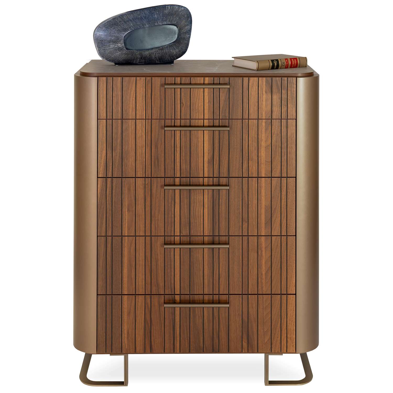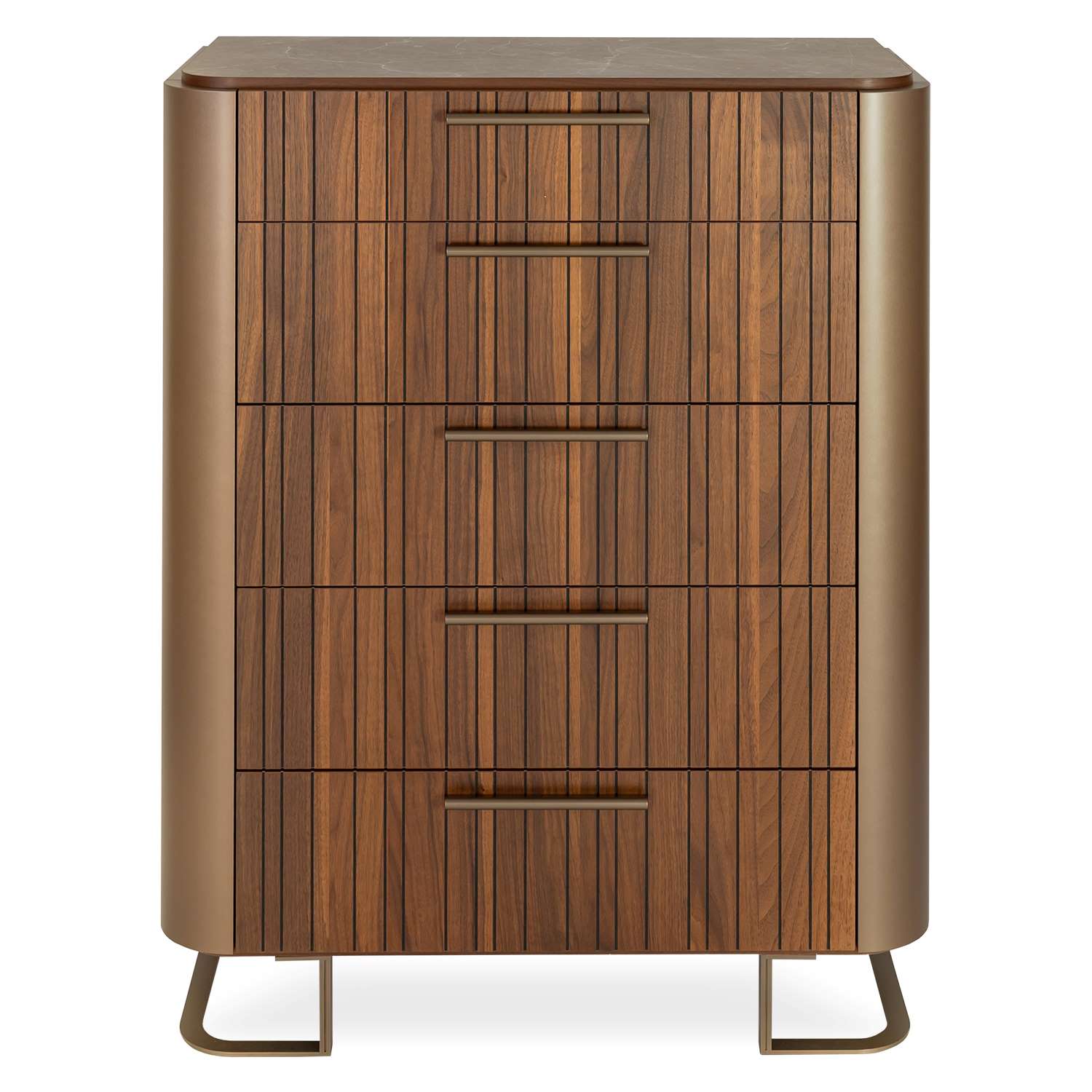 [0] => With its masterful blend of materials and textures, the Bella Ruggente High Chest embodies the pinnacle of contemporary luxury, with nods to mid-century modern design. Bella Ruggente's drawer fronts immediately catch the eye with their walnut veneer carved in irregular vertical channels. Gold lacquer adorns the curved sides of the nightstand, and the top is finished in grey eco-stone with white veining for an opulent look. Five soft-close drawers keep your wardrobe organized, while metal legs with a unique rounded shape add the finishing touch to this sumptuous, Italian-made nightstand.