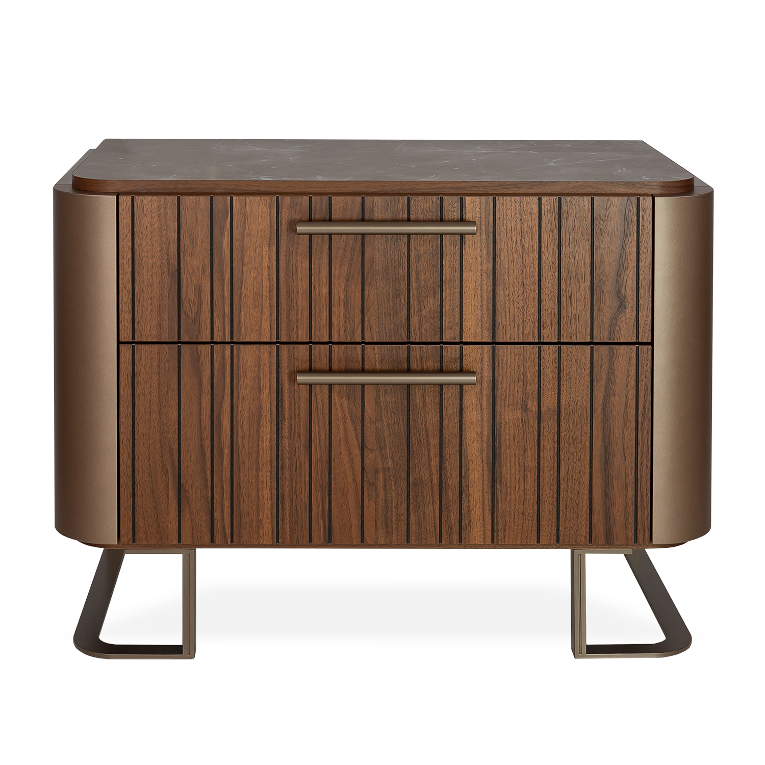 [0] => With its masterful blend of materials and textures, the Bella Ruggente Nightstand embodies the pinnacle of contemporary luxury, with nods to mid-century modern design. Bella Ruggente's drawer fronts immediately catch the eye with their walnut veneer carved in irregular vertical channels. Gold lacquer adorns the curved sides of the nightstand, and the top is finished in grey eco-stone with white veining for an opulent look. Two soft-close drawers keep your bedside essentials organized, while metal legs with a unique rounded shape add the finishing touch to this sumptuous, Italian-made nightstand.