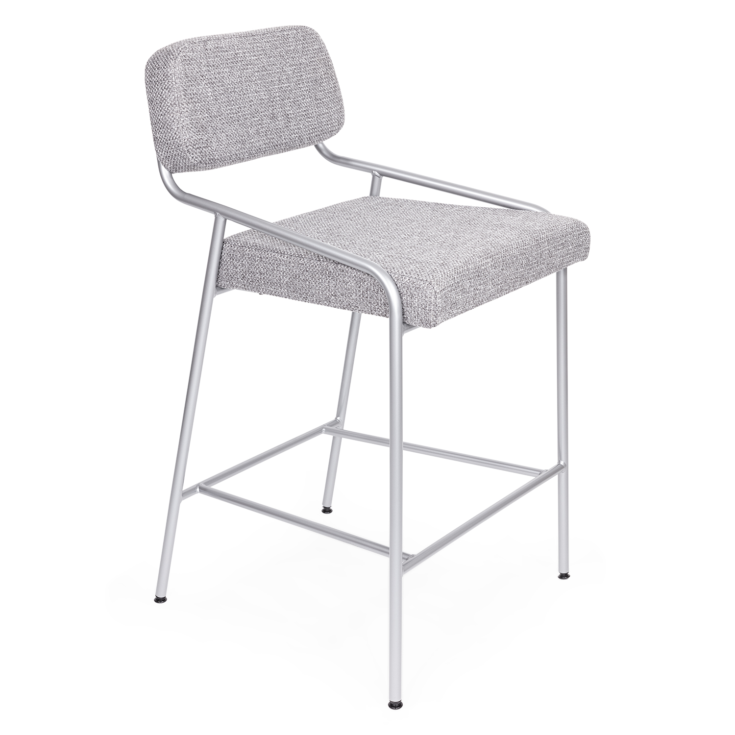 [0] => The Bellamy Counter Stool is a reinterpretation of classic 1960's Scandinavian style. The updated stool is contemporary and functional, with clean lines and an angular squared seat. A smooth magnetite frame supports the seat cushion and backrest, which are upholstered in durable tuxedo fabric with a chunky weave and variegated tones of black, grey, and white. A horizontal crossbar serves as a footrest for additional comfort. Bellamy's minimalist design, neutral fabric, and stylish lines make it the ideal versatile piece for any kitchen or dining space.