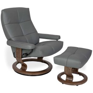 The Bergen Large Chair and Ottoman, designed by Stressless of Norway, has a distinctive design with cutting edge comfort technology. Its unique stitch pattern was inspired by traditional origami techniques, creating a delicate yet tailored look that lends itself well to a variety of design environments. Bergen includes the patented Plus and Glide systems which allow the chair to provide continuous support for the head and lower back, while also adjusting the reclining angle based on shifts of the body. Shown with a Classic circular bent beech wood base with a walnut stain and Paloma honey leather.