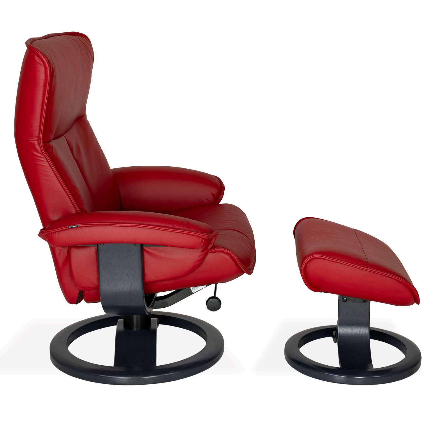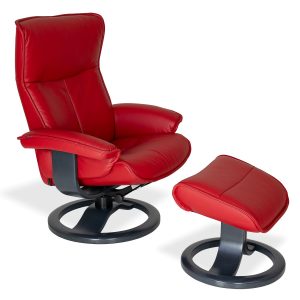 With a contemporary, ergonomic design, the Bismarck Small Recliner is engineered for your comfort. The recliner features the Fjords® Active Release System™, which adjusts the neck angle of the seat as you move. The 360° swivel base in charcoal-stained wood laminate makes it easy to place the chair anywhere in a room. The gentle rounded lines of the base complement the graceful curves of the seat, and the soft chili red top-grain leather adds another layer of comfort and the feel of everyday luxury.