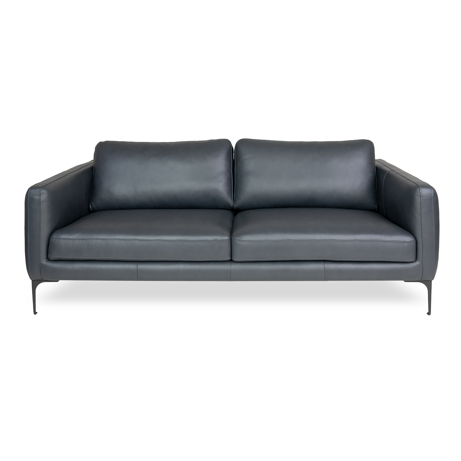 Upholstered in dark blue leather, the Blios Sofa features supportive seat cushions and stylish tufting along its back and sides. Soft back cushions are mounted with Velcro for easy removal, while the matte black metal legs have a slim shape that forms a contrast with the sofa's fuller profile. With its classic look and deep color, Blios will complement a variety of interiors both traditional and modern.